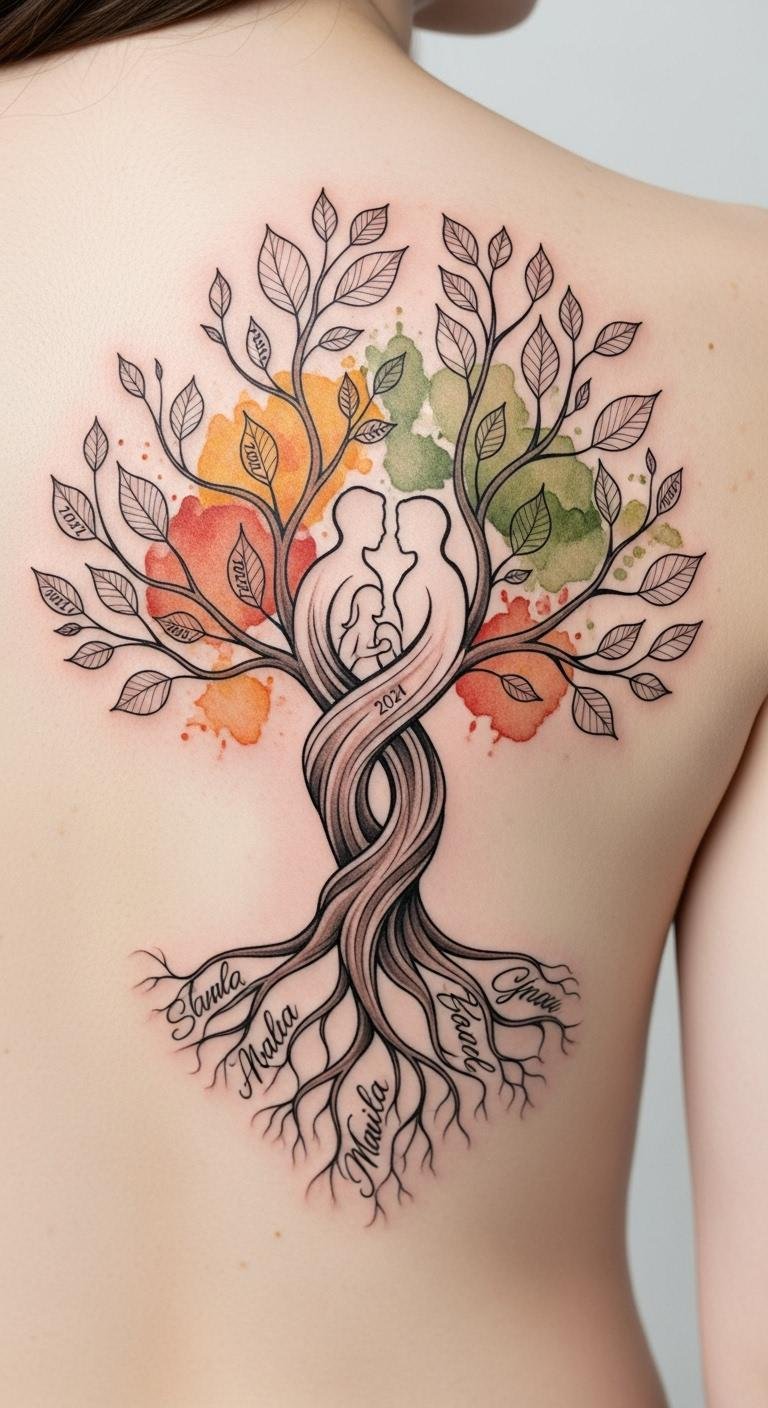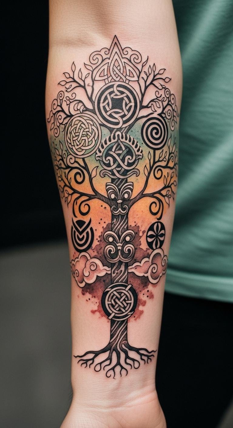 This concept blends ancestral imagery and cross-cultural symbols into a single, cohesive forearm piece meant to honor fatherhood and lineage; the family tree trunk anchors the design while branches transition into different heritage motifs to represent diverse roots and shared legacy. Emotionally it conveys reverence, continuity, and pride—invoking connection across generations—while the warm earth-tone watercolor wash softens the imagery for a heartfelt, living-tapestry feel. Ideal placement is the inner forearm, allowing intimate visibility and easy extension into sleeve work, with shading and line weight chosen to age gracefully and remain legible over time.