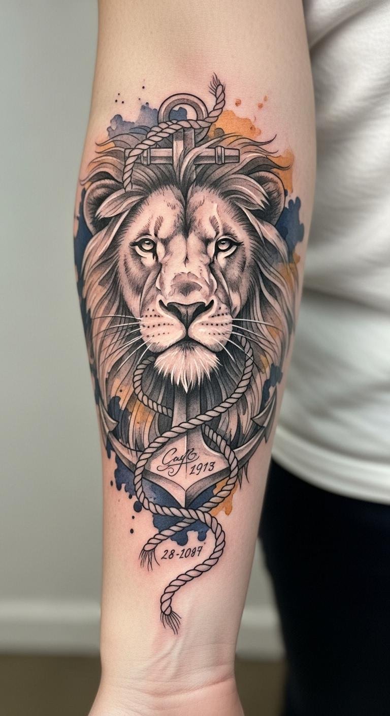 The lion represents protective strength and noble leadership, the anchor signifies stability through storms, and the hidden dates personalize life milestones; placed on the forearm it offers visibility for everyday reassurance while allowing easy concealment, evoking pride, memory, and quiet endurance.