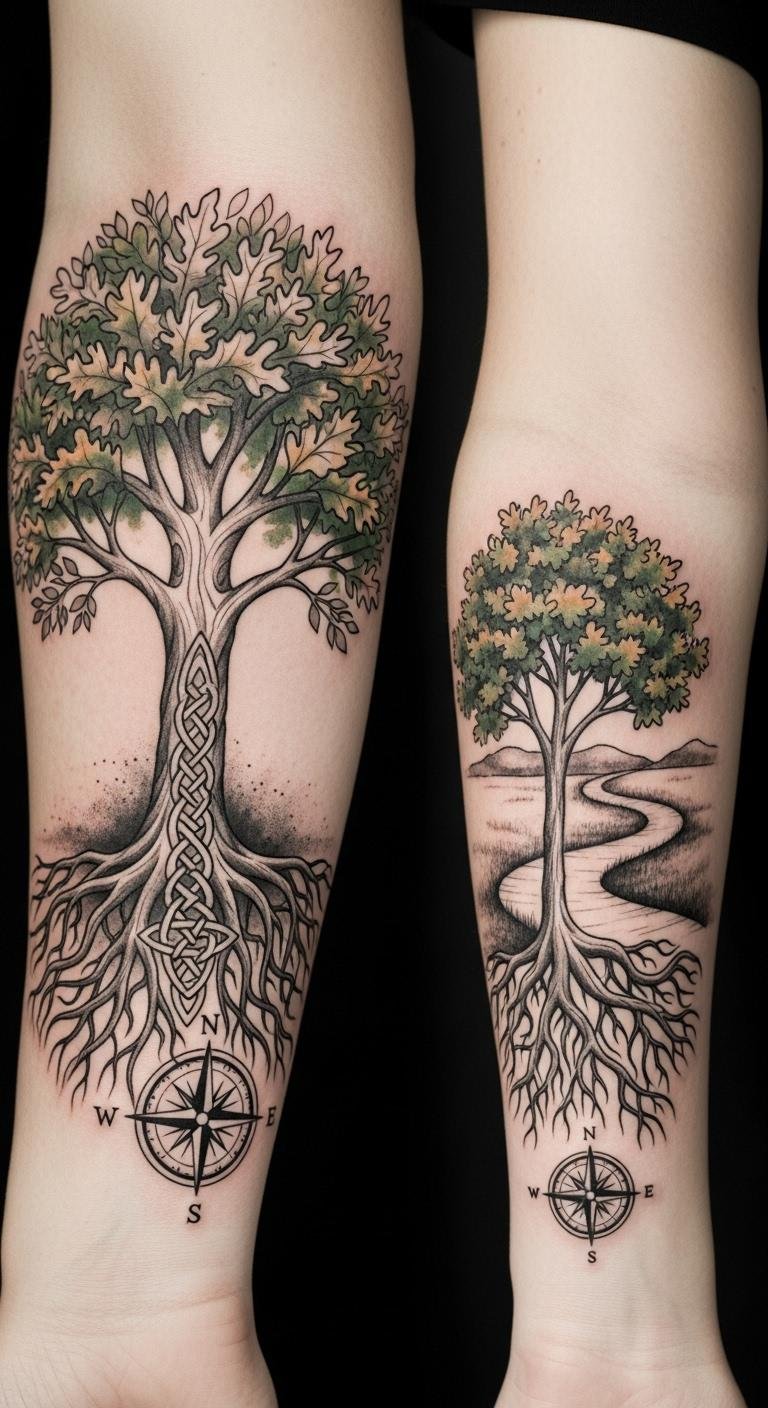 Whether through shared symbols or matching designs, these tattoos celebrate your journey together, honoring the lessons learned and the unwavering support that defines your relationship. This design pairs the mature oak and the sapling to symbolize guidance, growth, and legacy; the Celtic knotwork represents the unbroken continuity of family, and the compass rose signifies shared direction and values.