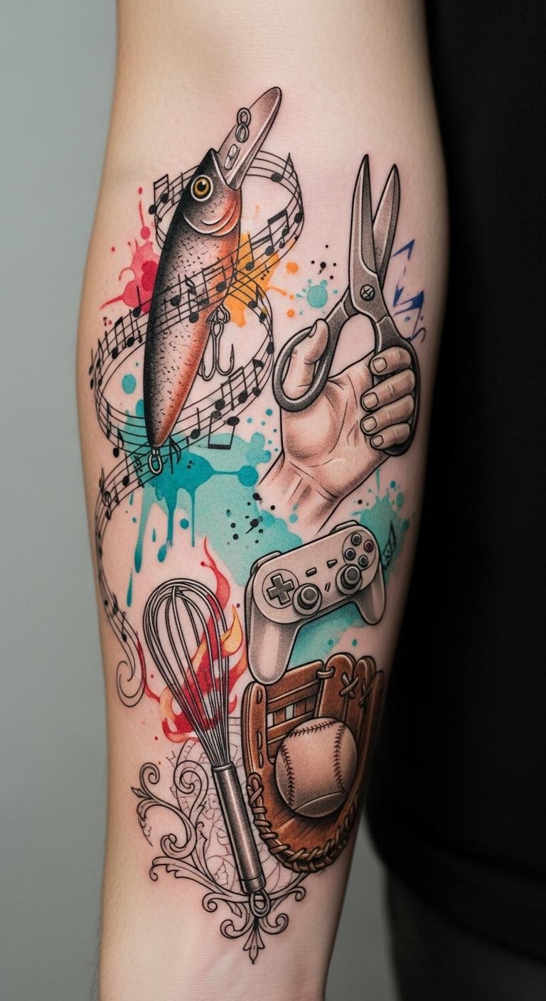 From intricate craftsmanship tattoos of your favorite sports to vibrant music motifs and outdoor adventures, these hobby inspired designs reflect your essence, showcasing artistic expressions and cooking symbols that celebrate your unique journey and love for gaming elements.