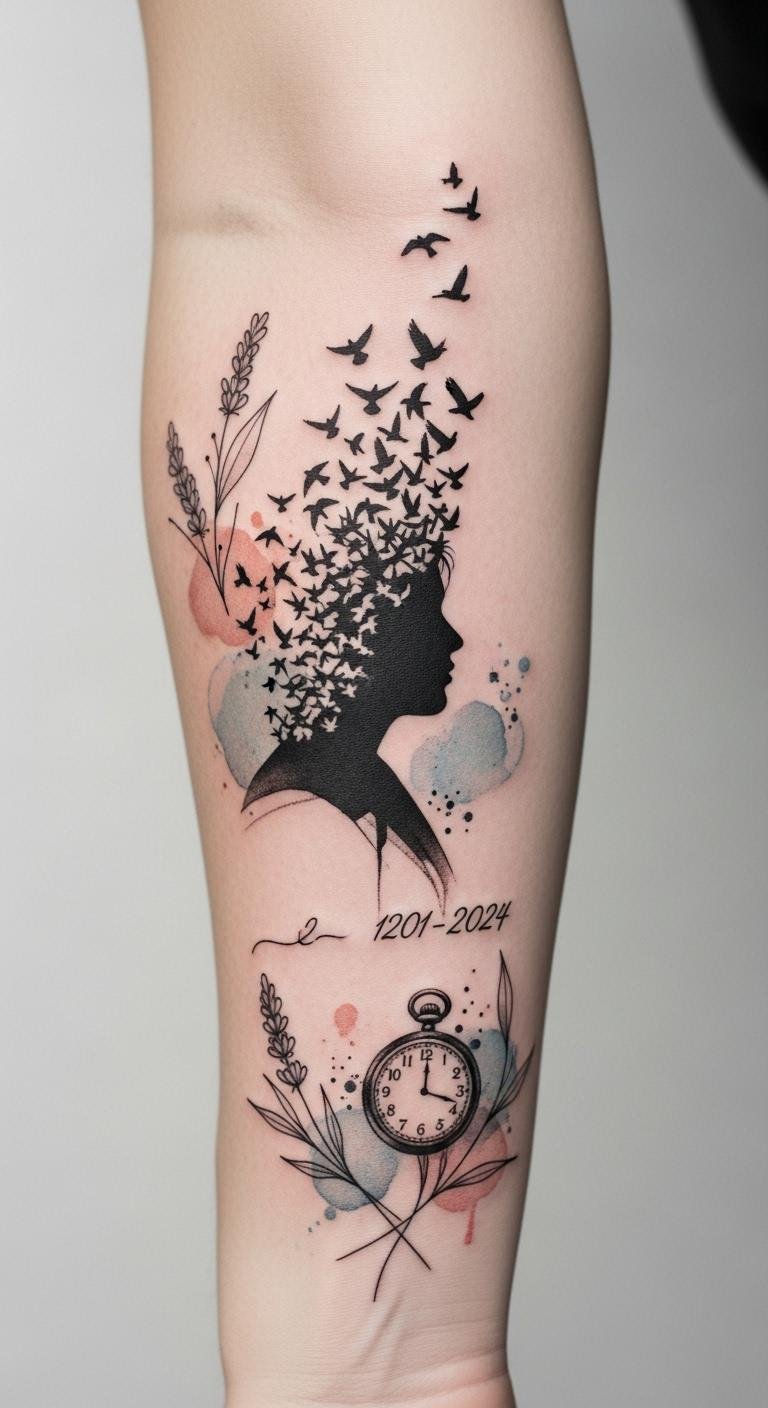 You honor their memory while embracing your journey, transforming pain into beauty, and creating a lasting connection that keeps their spirit alive within you. This design uses the silhouette dissolving into birds to symbolize release and continuation, the stopped pocket watch and date to mark the moment that anchors memory, and lavender to convey calm and remembrance; placed on the inner forearm it allows private reflection and gentle visibility for moments of connection.