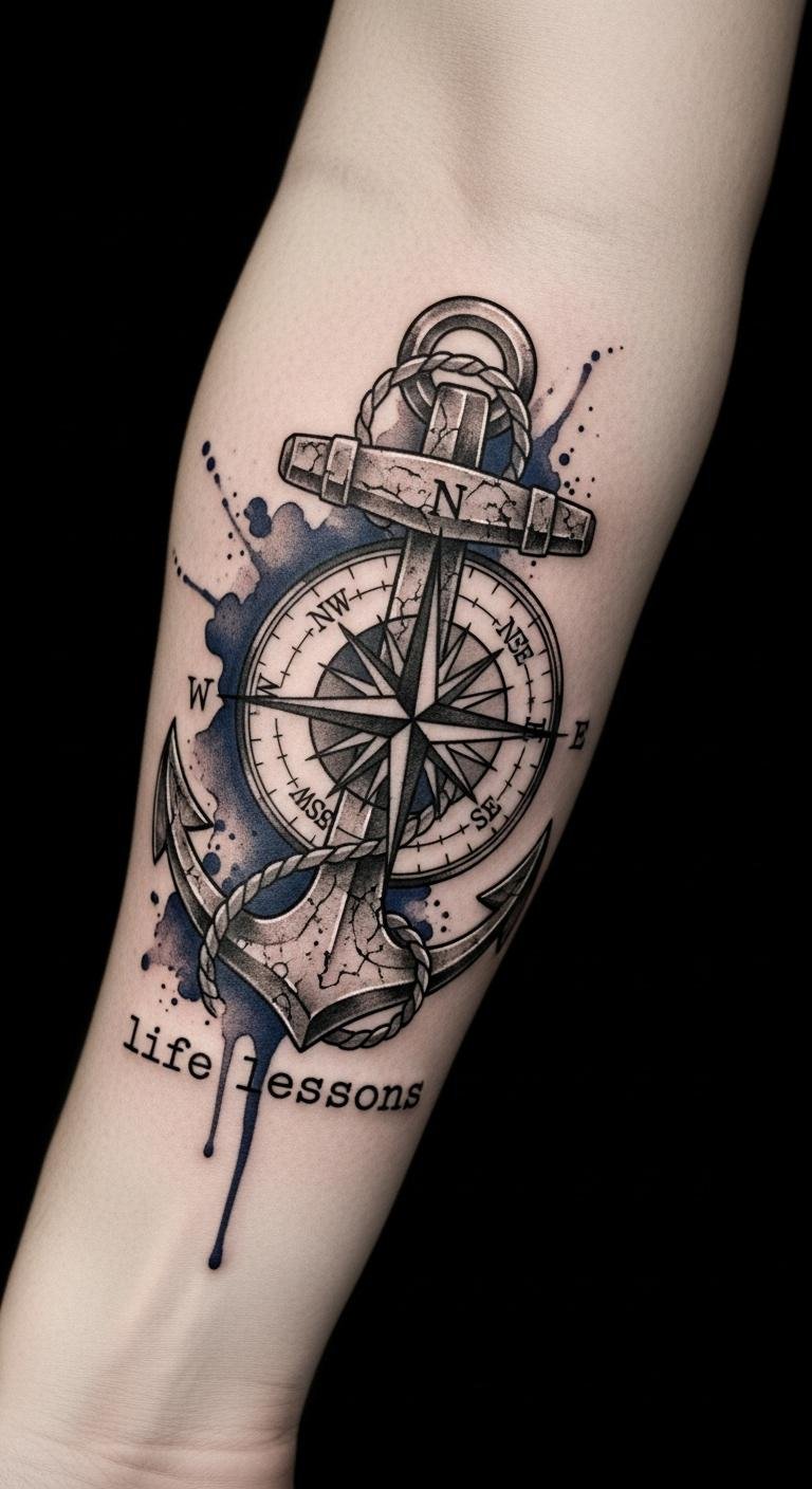 Whether it’s an anchor or a compass, these tattoos serve as a daily reminder of the life lessons that shape your identity and inspire your path forward. The anchor represents stability and grounding provided by paternal guidance, while the compass rose symbolizes direction and moral navigation; the vintage script ties personal narrative to memory.