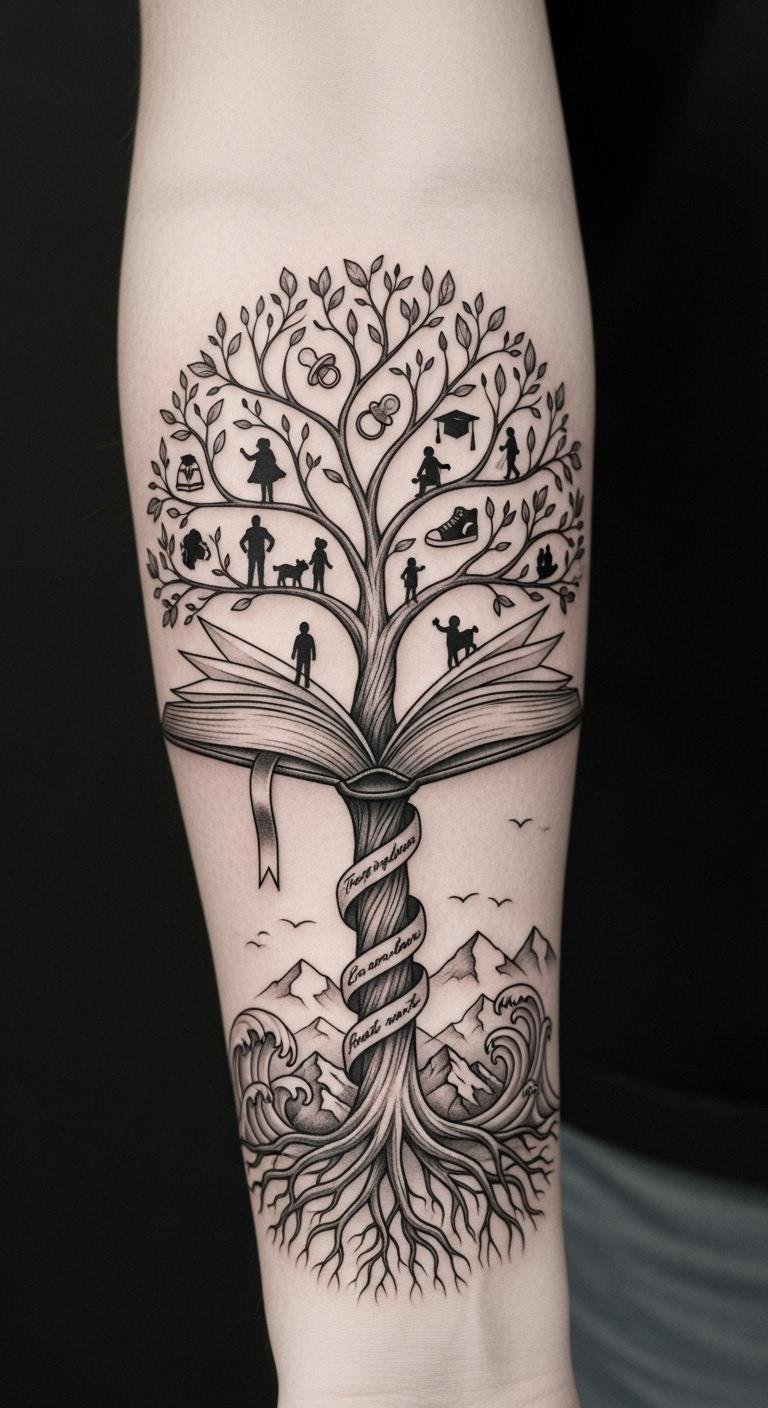 This design symbolizes the evolving chapters of fatherhood—an open book as life’s narrative, a tree representing growth and rootedness, and the small icons marking key milestones; the waves and mountains acknowledge emotional highs and lows while the ribbon suggests a personal motto or name.