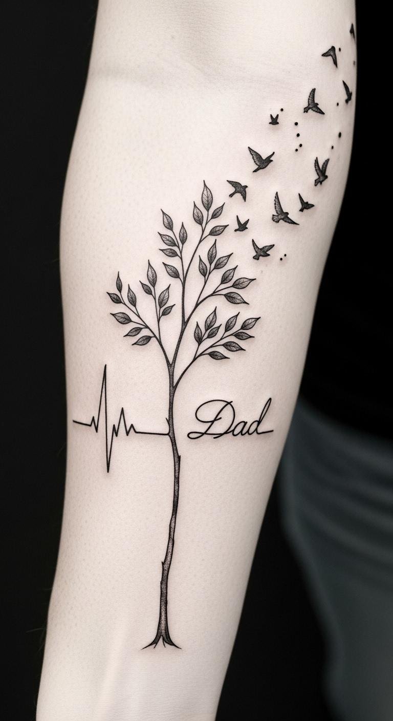 Memorial tattoos often draw inspiration from nature, capturing the profound connections that trees and roots symbolize in our lives. Tree symbolism reflects family bonds, while root connections showcase nurturing strength. Embrace organic designs that mirror life cycles and seasonal changes, weaving environmental themes into your ink. These nature motifs echo growth imagery, celebrating the enduring love and legacy shared with your father. Place the design over the heart for intimate remembrance, along the forearm for daily visibility, or on the back/shoulder as a larger, contemplative piece; the imagery evokes grounding comfort, continuity, and quiet resilience.