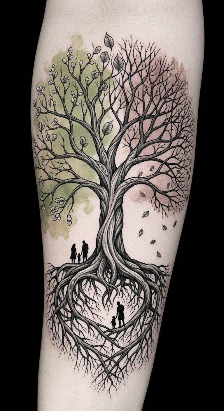 Connection art like roots imagery captures the essence of family connections, reminding you of your legacy symbols. Each tattoo tells a unique family narrative, honoring the love and strength that runs through your veins. This design symbolizes continuity and resilience—roots anchoring the present, branches reaching toward the future—evoking warmth, belonging, and reverence for ancestors.