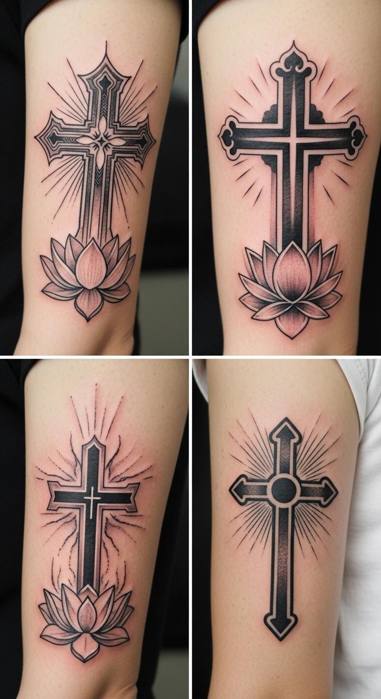A design centered on a softly shaded cross merging into a blooming lotus at its base, framed by subtle, flowing script of a cherished family word or date; delicate rays or water ripples radiate outward to suggest blessings spreading through time. Symbolically this combines faith (cross) and spiritual growth (lotus) with familial continuity (scripted word/date), evoking emotions of gratitude, protection, and enduring connection. Ideal placements include the inner forearm or over the heart for visibility and intimacy, or the shoulder blade for a more private tribute that can expand with additional family elements.