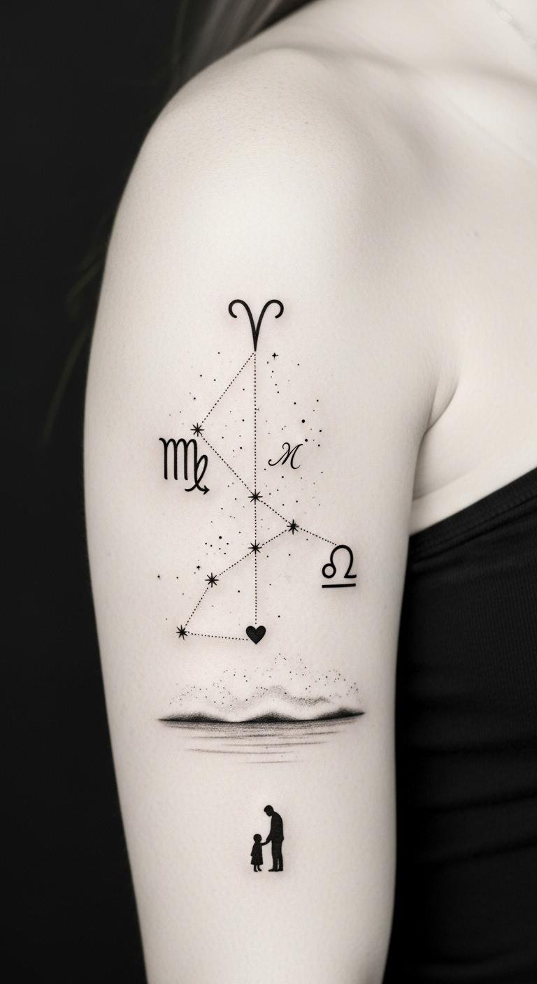Constellation meanings can also tell your story, celebrating shared moments under the stars, reminding you both of the limitless love you share. The design symbolizes guidance (the constellation as a map), inheritance of traits (the zodiac glyph), and intimate connection (the hidden heart/initial and silhouettes), evoking quiet emotion and timeless devotion; ideal on the inner forearm for daily closeness, shoulder blade for a private tribute, or over the chest for a deeply personal placement.