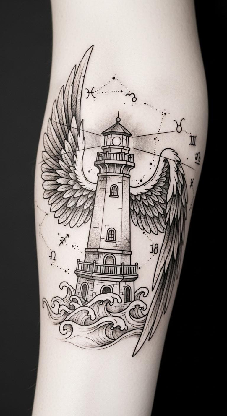 This design blends celestial connection and guardianship: the wings offer shelter, the lighthouse provides guidance, and the faint constellations tie in personal heritage; best placed on the inner forearm or upper shoulder to read as a comforting emblem when you need reassurance, evoking steady emotion and intimate protection.