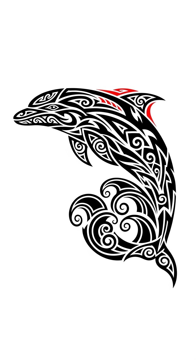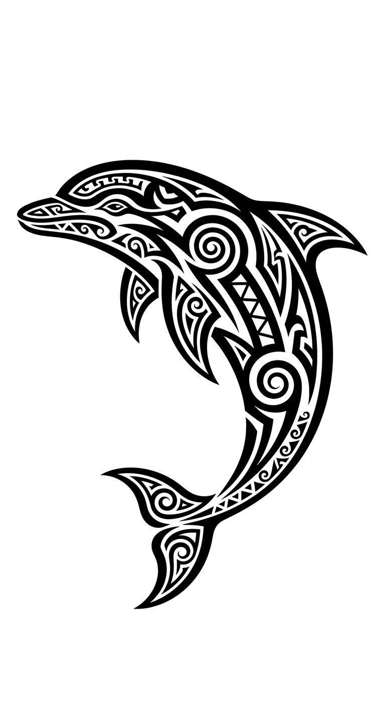A flowing tribal dolphin design built from bold black curves and negative space, incorporating spiral motifs and wave elements to symbolize life cycles and motion; ideal for a forearm wrap, shoulder blade, or calf placement where the lines can follow the body’s natural contours, evoking freedom, fluidity, and a deep connection to ancestral and natural forces—wearing it invites calm, playful energy and a reminder of harmony between human spirit and the sea.