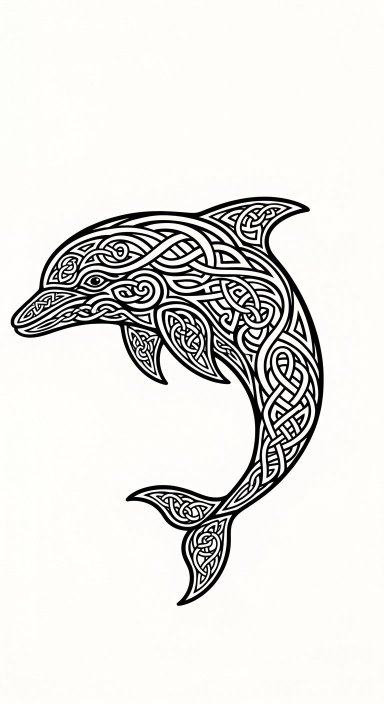 A flowing mid-forearm tattoo that positions a leaping dolphin formed from continuous Celtic knotwork, with subtle wave patterns and spirals radiating outward; rendered in fine black lines with optional deep teal shading to suggest ocean depth. Symbolically the design marries intuition, protection, and communal bonds (dolphin) with eternal cycles and interconnectedness (Celtic knots), evoking calm confidence and a longing for freedom. Emotionally it feels both protective and playful, suited for someone who values heritage and personal journey; ideal placement is the outer forearm or along the ribcage where the motion of the dolphin complements body contours.
