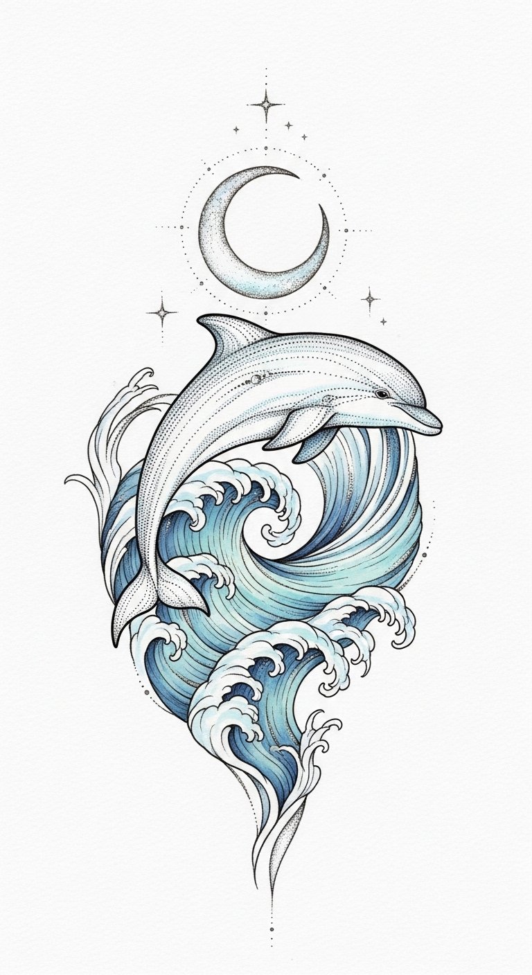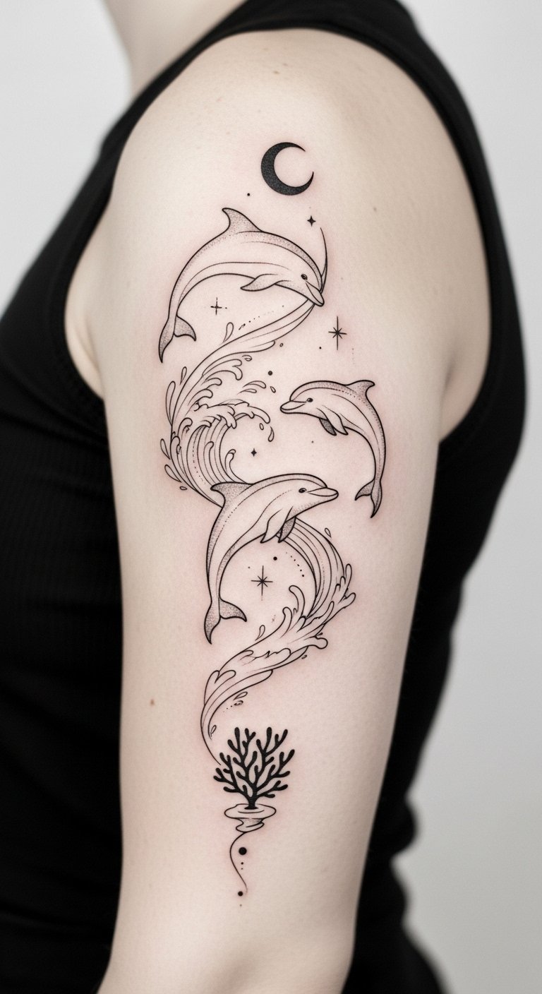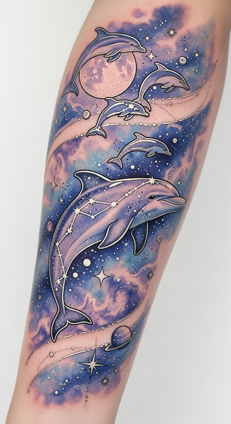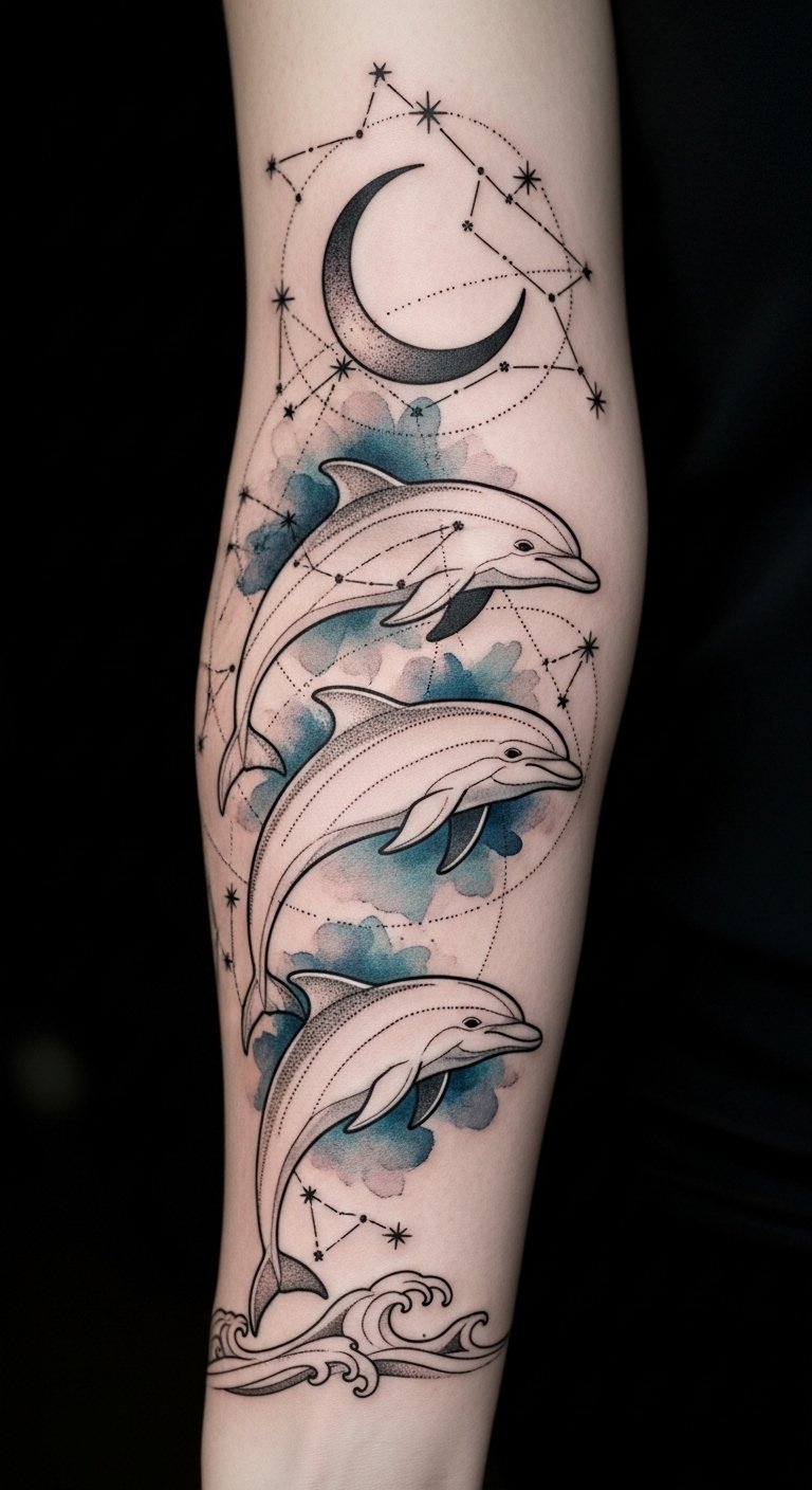 This tattoo design captures your connection to both the ocean and the universe, celebrating your unique journey. The symbolism blends freedom, intuition, and exploration—dolphins for emotional intelligence and playfulness, celestial elements for guidance and the vast unknown—evoking serenity and wonder; ideal placement follows natural body curves such as the forearm, ribcage, or shoulder blade to emphasize flow and movement.
