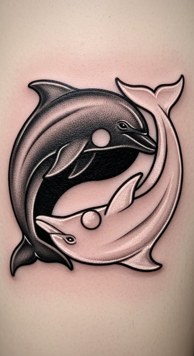 A graceful pair of dolphins form the curved halves of a yin-yang, one shaded deep midnight blue with subtle star-like specks, the other in pearly white with soft aqua highlights; flowing waterlines, tiny bubbles, and minimalist wave accents surround them, suitable for a forearm, upper back, or ankle—symbolizing balance, connection, and the cyclical rhythms of life; the design evokes calm joy, freedom, and acceptance of opposites, encouraging the wearer to honor both strength and gentleness in their personal journey.