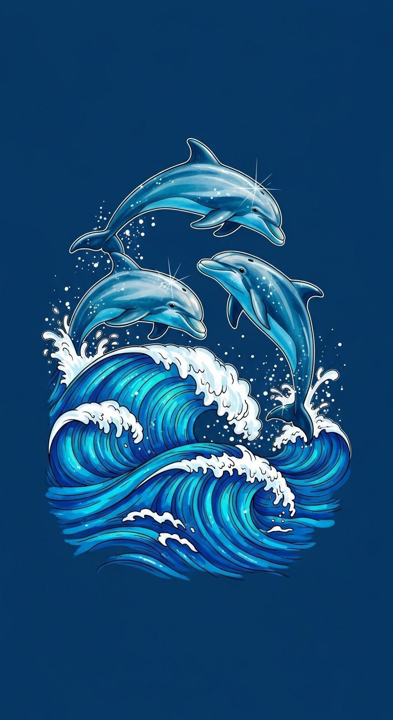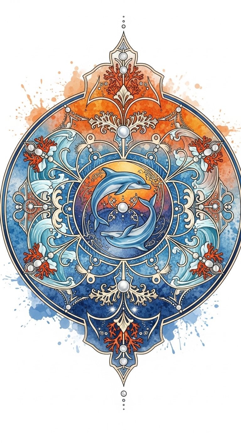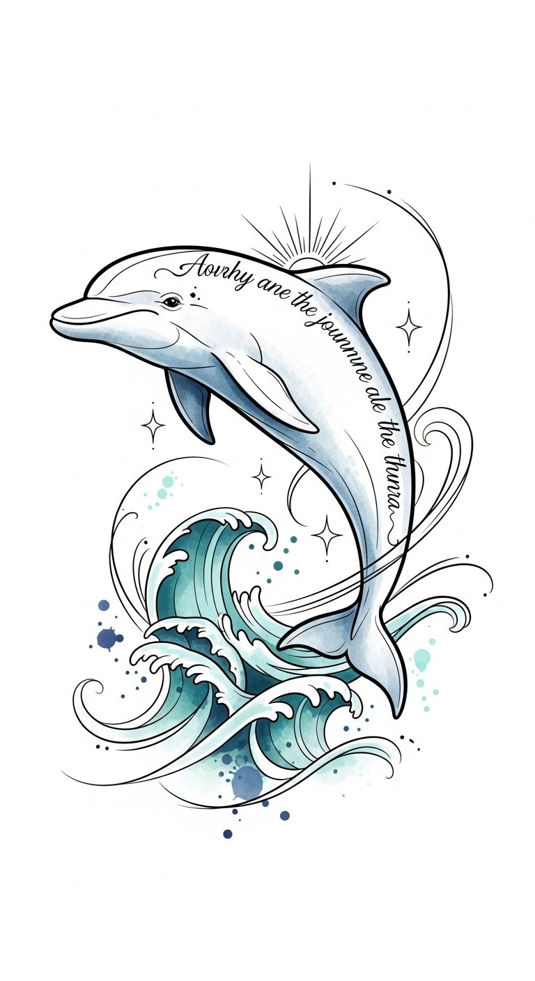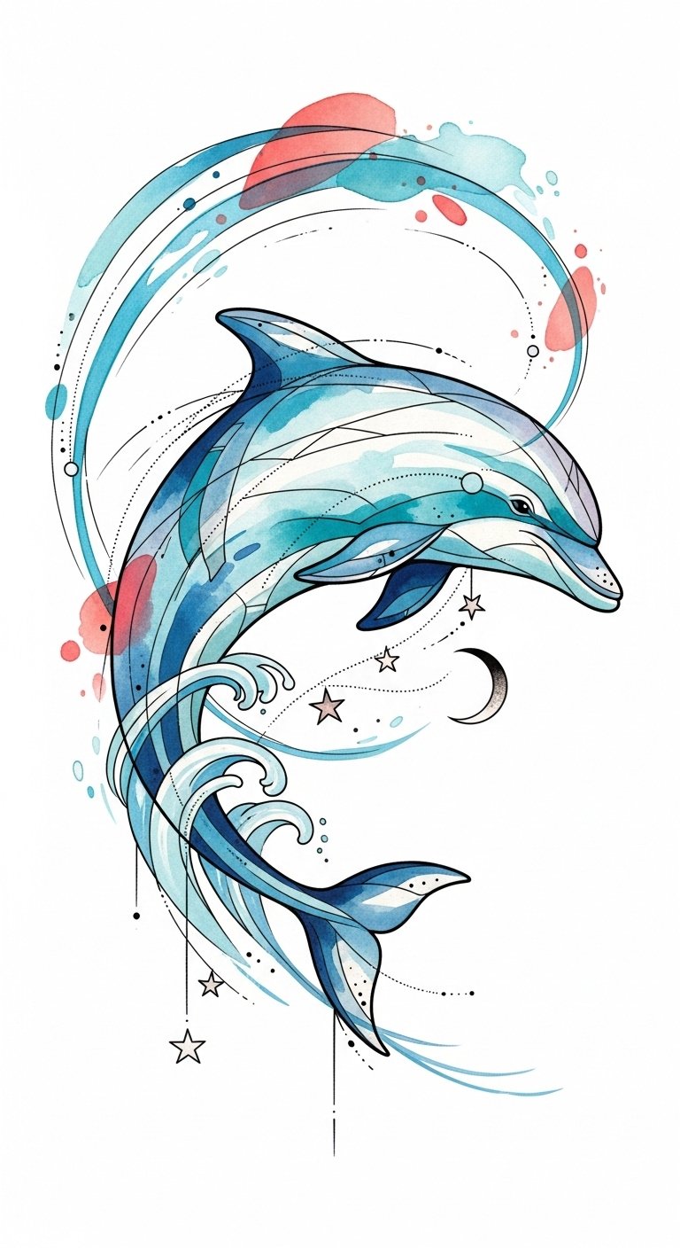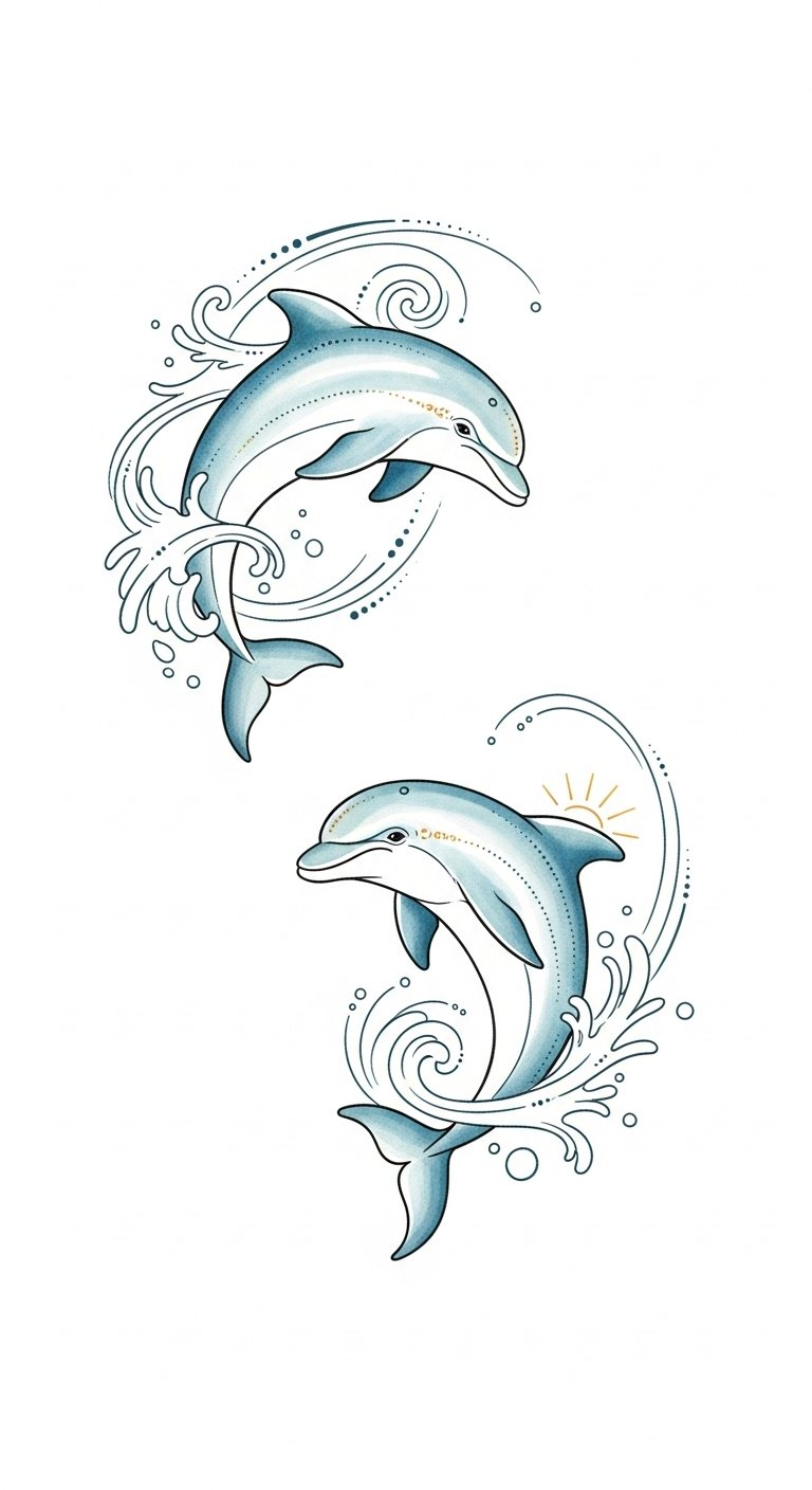 This design symbolizes freedom, joy, social bonds, and adventurous spirit through the energetic motion of the dolphins and harmonious wave elements; the watercolor hues evoke emotion and serenity while golden accents bring warmth.