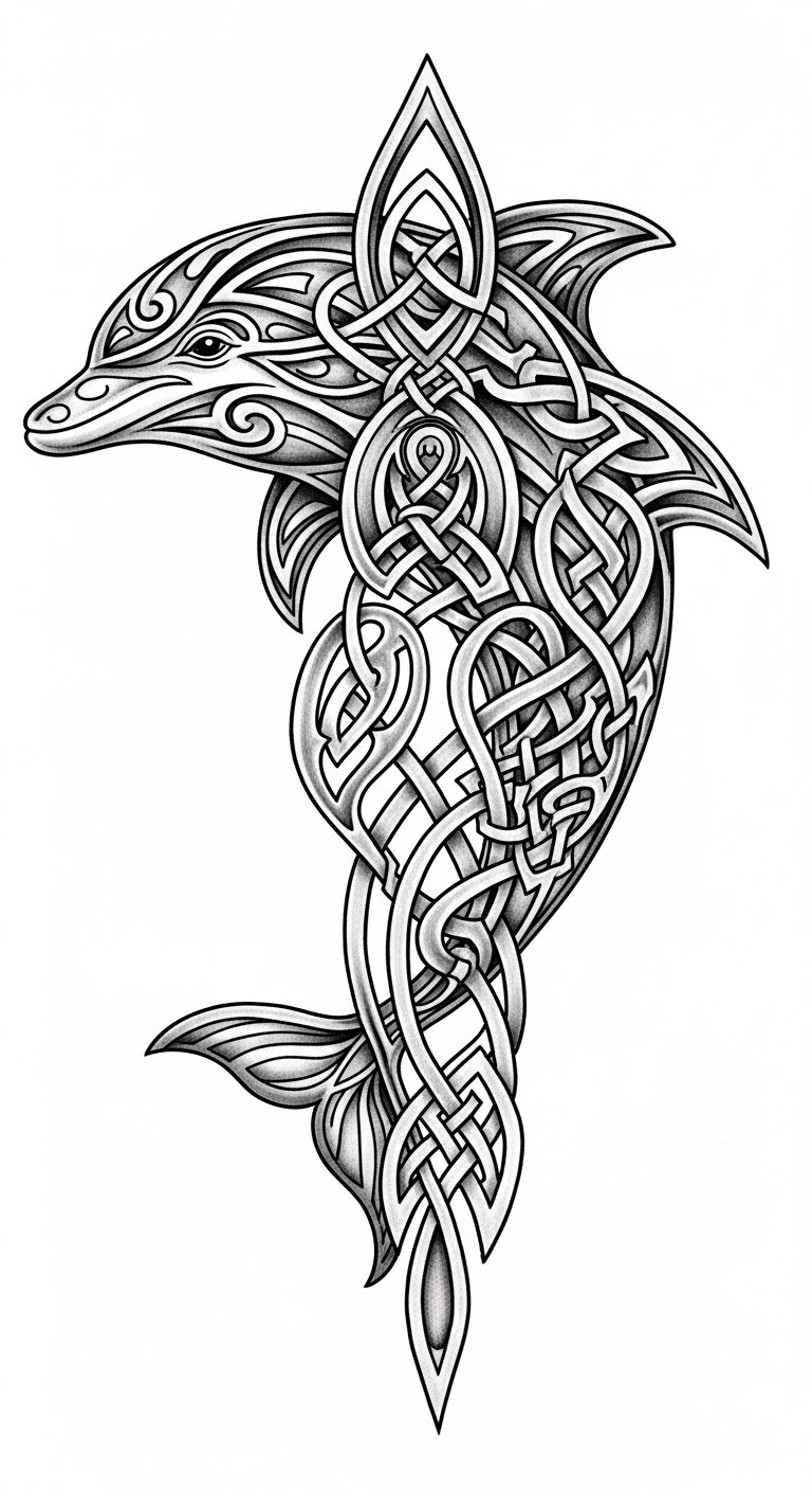 This concept envisions a flowing, interlaced dolphin and Celtic-style knotwork forming a continuous loop around the forearm or shoulder blade, executed in fine black lines with subtle blue-gray shading and hints of white ink highlights; incorporate negative space to suggest motion and use varying line weight for depth, allowing the dolphin to emerge from the knot so it appears both bound and free.