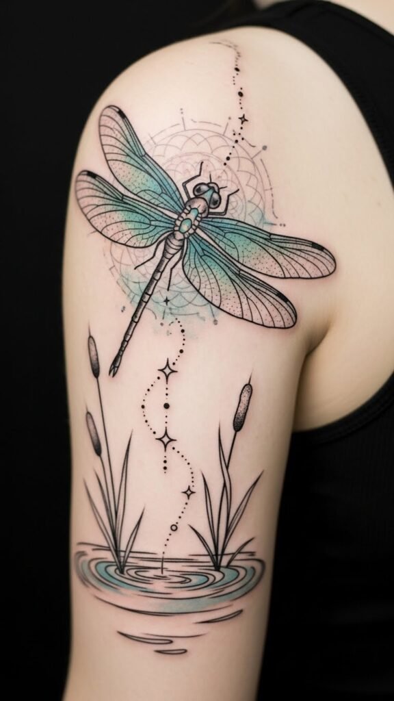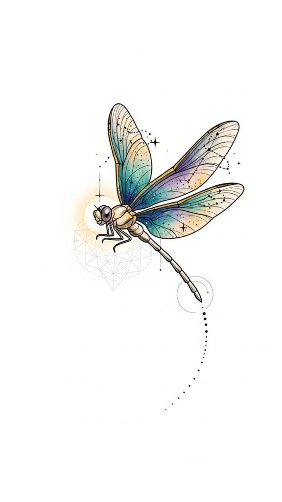With a celestial dragonfly, you’re not just marking skin; you’re embracing the cosmos. This design channels the dragonfly’s themes of transformation and lightness with cosmic imagery to evoke wonder and personal renewal; emotionally it speaks to remembrance, freedom, and spiritual curiosity.