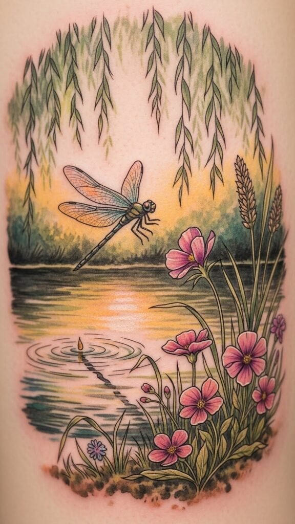 While geometric designs offer a contemporary flair, nature-inspired dragonfly scenes immerse you in the beauty of the natural world. These tattoos evoke a profound nature connection, symbolizing your bond with the earth. Picture a dragonfly dancing above vibrant flowers or gliding over tranquil waters, representing freedom and transformation. Each stroke captures the essence of earth symbolism, reminding you of the limitless possibilities within nature. This design channels serenity and renewal—perfect for a forearm, shoulder blade, or ribcage where the vertical composition can follow the body’s natural lines; it conveys groundedness and gentle movement, inviting viewers to feel calm, hopeful, and connected to the landscape it depicts.