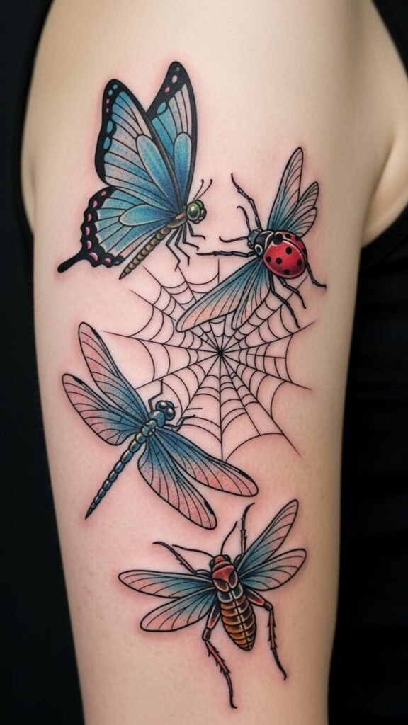 A design combining multiple hybrid dragonfly-insect forms creates a tapestry of motion and contrast: delicate translucent wings of the dragonfly butterfly, the rounded, bold spots of the dragonfly ladybug, and the geometric silk of the dragonfly spider’s web interwoven behind them.