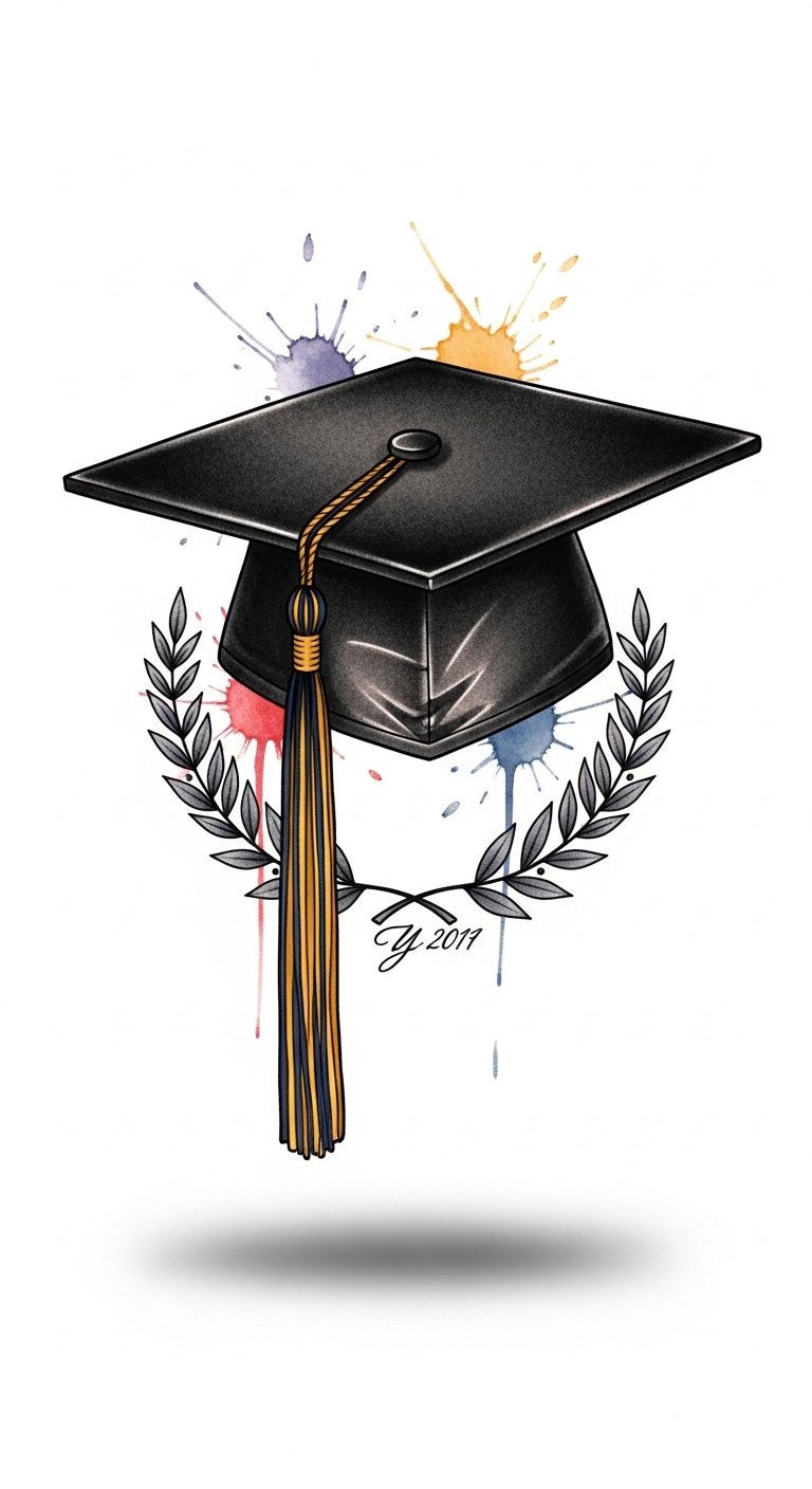 The design combines formal emblematic elements (mortarboard and laurel) with personal touches (date/initials, school colors) to evoke pride, accomplishment, and hopeful forward motion; place on the upper arm for proud visibility or the ankle for a private, intimate reminder.