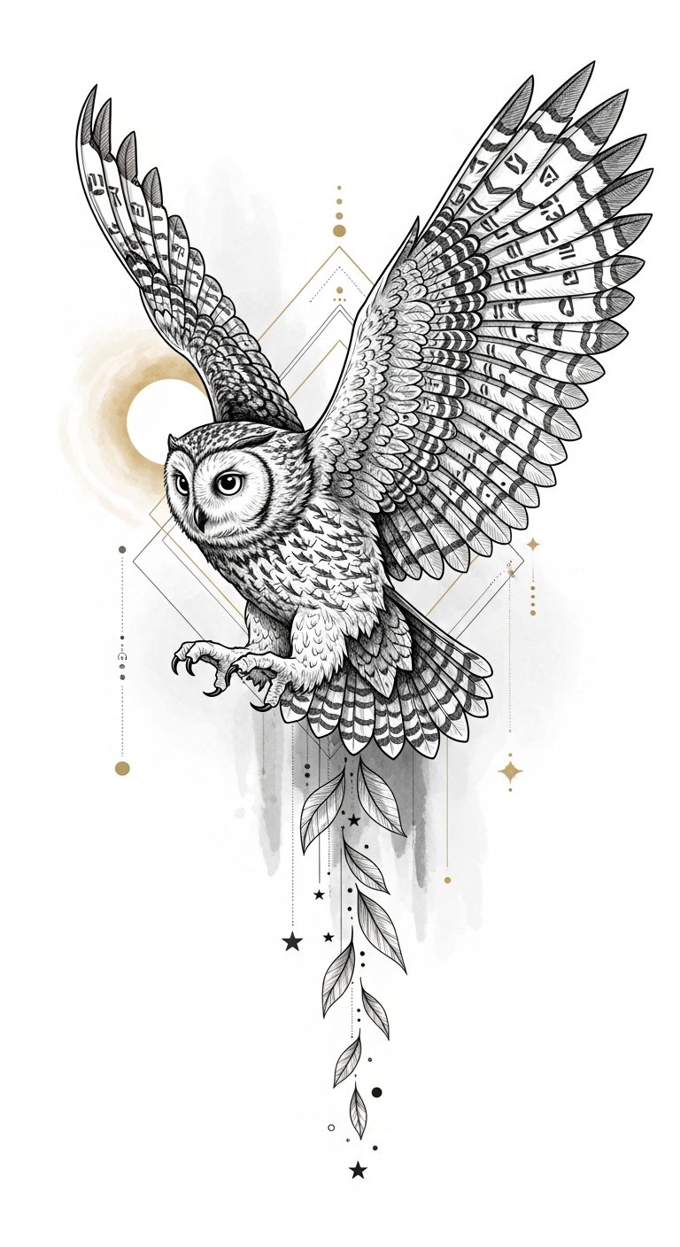 The design’s symbolism combines nocturnal insight (moonlit eyes) and personal evolution (rising leaves and stars), evoking calm confidence and quiet power; ideal placement follows the natural sweep of the body—forearm, upper arm, shoulder blade, or side rib—so motion and flow mirror the wearer’s journey.