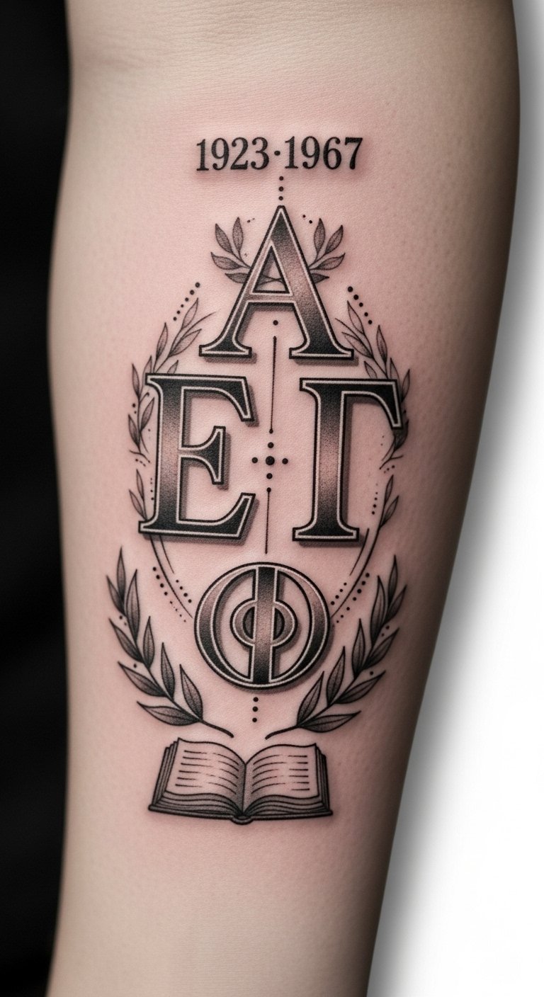 The laurel wreaths symbolize honor and victory, the open book represents learning and shared academic pursuit, and the intertwined letters signify unity and lifelong connection; place it where intimacy or visibility matches the emotion you want—near the heart for deep sentiment, the upper arm or forearm for communal pride.