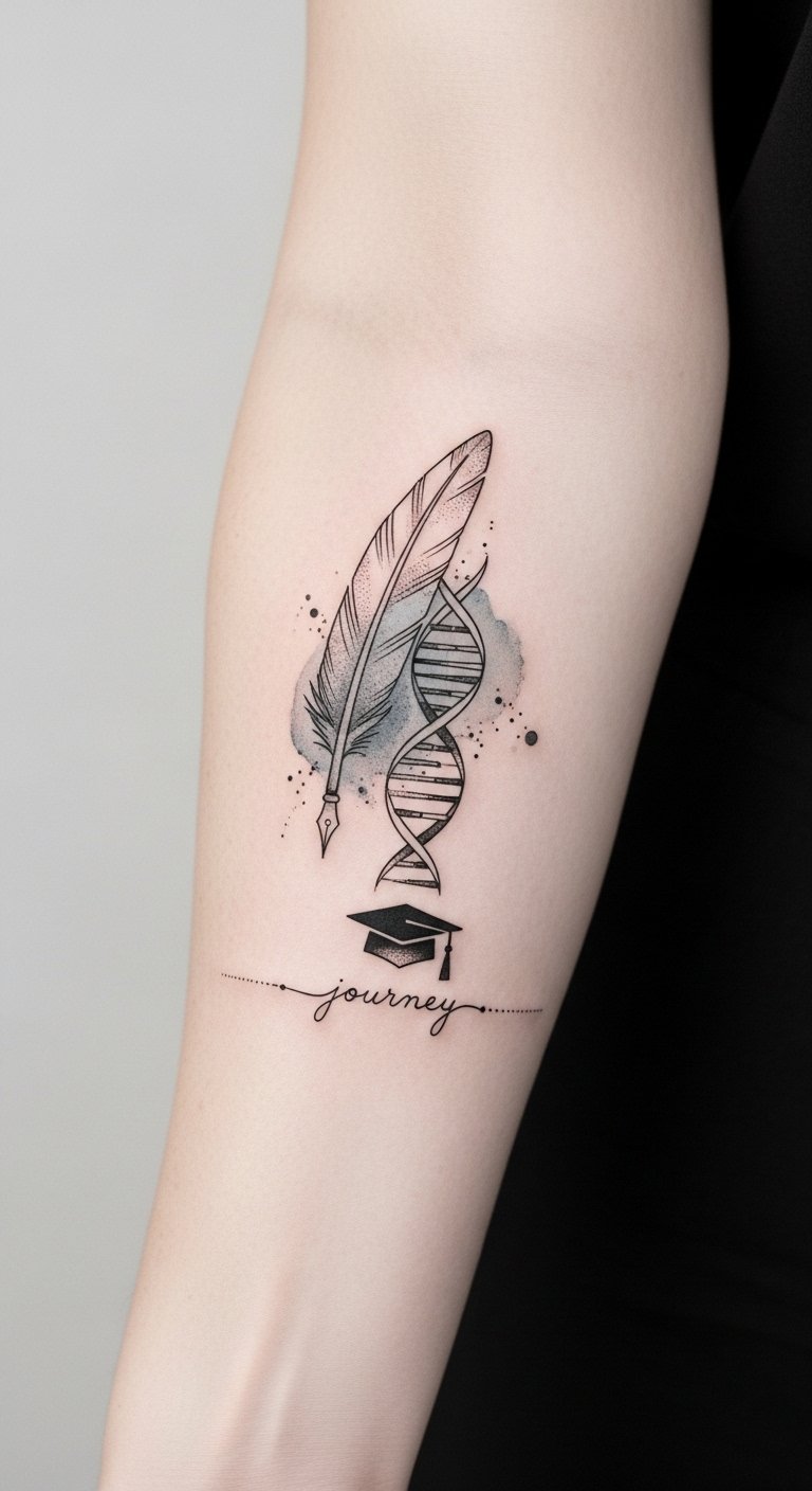 As you stand on the brink of graduation, have you thought about how to commemorate this significant milestone? Graduation tattoos offer a unique way to celebrate your journey, embody your hard work, and express your future aspirations. From elegant designs to personal symbols, each tattoo can tell your story. What if you could carry a piece of your achievement with you forever? Discover the inspiring designs that resonate with your experience and dreams. The imagery symbolizes knowledge (the open book), liberation and future possibilities (pages becoming birds), achievement and honor (laurel wreath and graduate-cap colors), and a personalized milestone (the date); emotionally it balances pride and hopeful anticipation, and it suits the inner forearm for visibility when you want to share the memory and concealment when necessary.