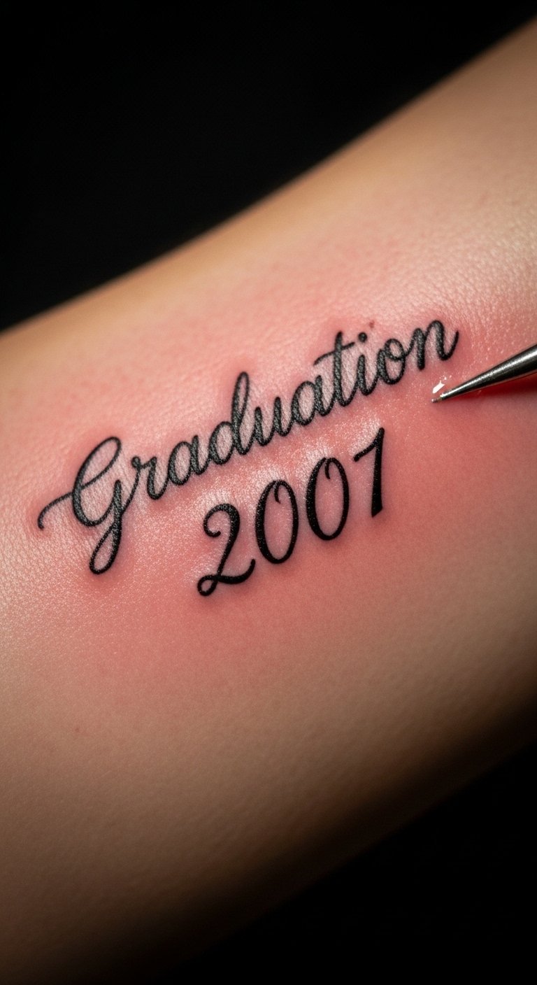 Celebrating your graduation with a tattoo that features your graduation year can serve as a lasting reminder of your hard work and dedication. This simple yet powerful design captures your graduation date, symbolizing your journey and future aspirations. Whether you choose elegant script or bold numbers, this tattoo embodies freedom and the endless possibilities that lie ahead, inspiring you every day. Place it on the inner wrist for a personal daily reminder, the collarbone for a subtle statement, or the forearm for visibility; the choice of font, size, and minimal accents (laurel, small star, or subtle linework) will shape the emotional tone from intimate nostalgia to bold triumph.