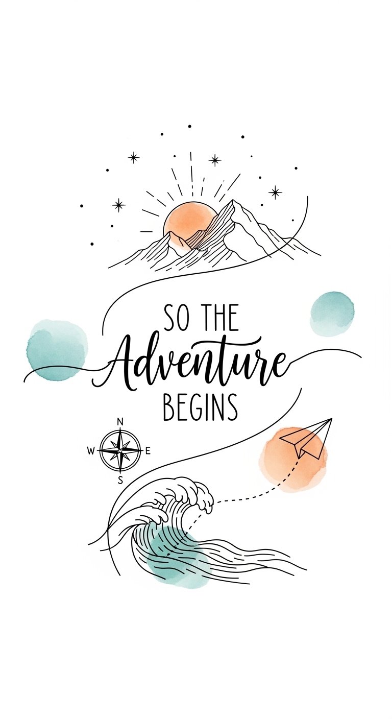 This design pairs the literal phrase with visual motifs of journey and discovery: the winding path suggests movement, mountains and waves symbolize challenges and freedom, the compass and paper airplane hint at direction and playful spontaneity, while watercolor tones evoke dawn and optimism.