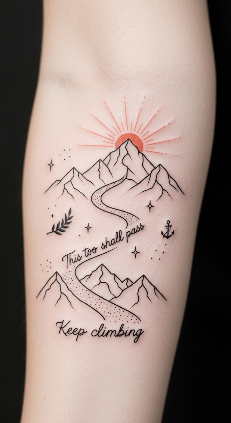 The design visually ties the text’s message to a personal narrative: the ascending path represents ongoing effort, the sun symbolizes hope and renewal, and the small resilience icons are quiet anchors of memory and courage; placed on the inner forearm it reads as a private mantra you can glance at for calm, encouragement, and to honor each step forward.