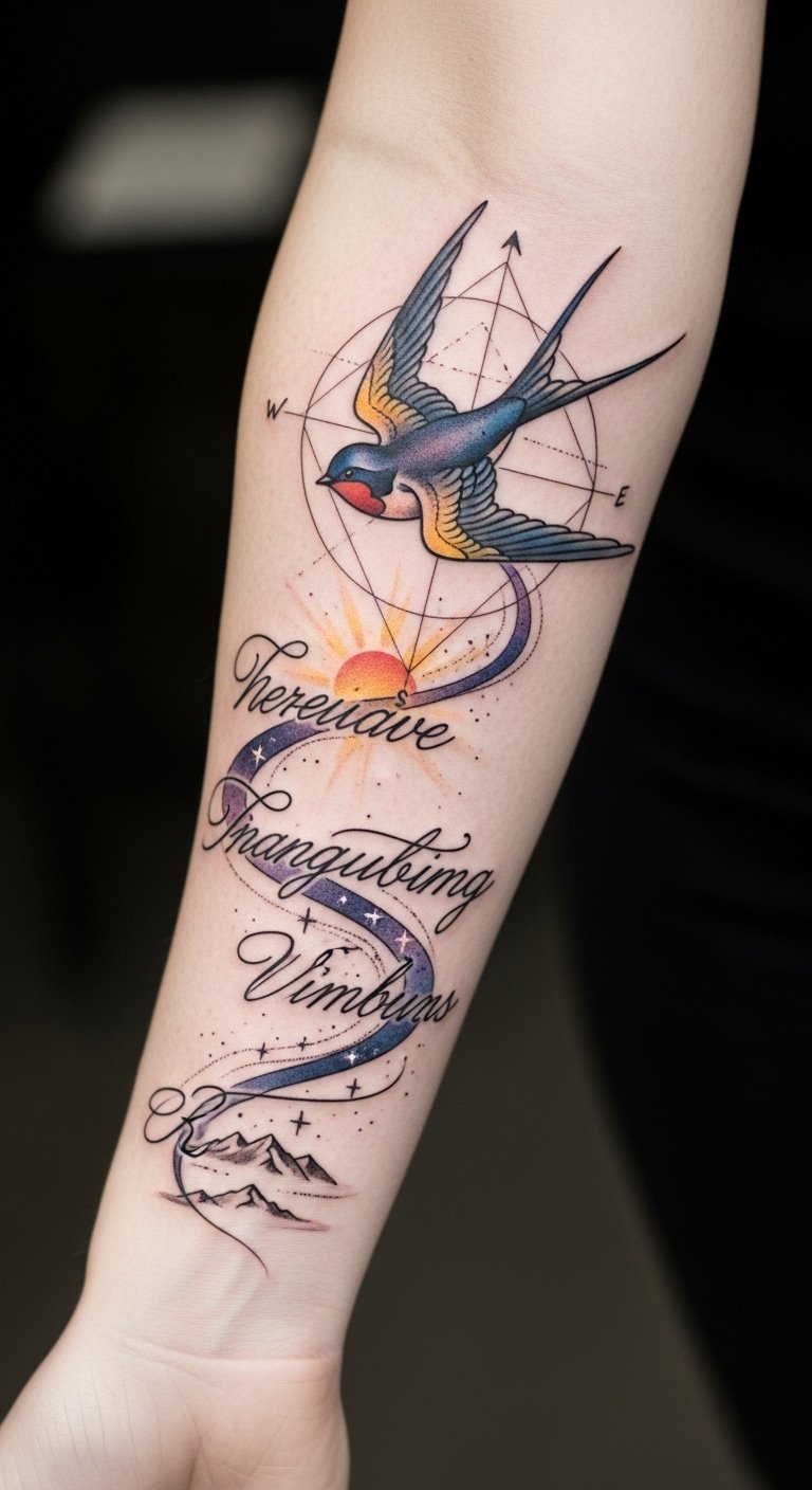 Each word becomes a beacon, guiding you through challenges, celebrating victories, and keeping your spirit alive as you chase your dreams. The design uses the swallow as a symbol of freedom and forward movement, sunrise colors to evoke hope and renewal, and compass geometry to represent direction and purpose.