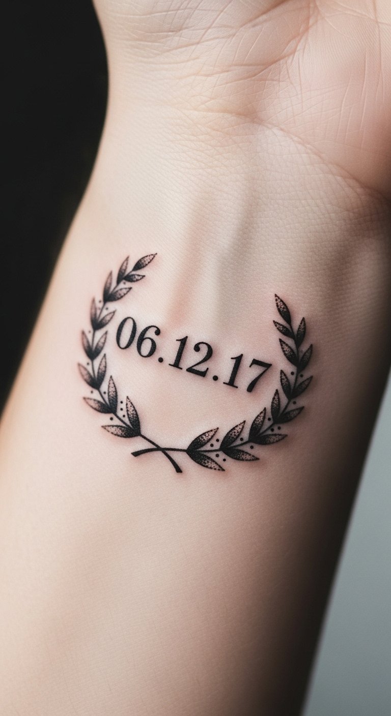 Choose a style that speaks to you, whether it’s a simple date or an elaborate design, celebrating your unique path with every glance. This design pairs the clarity of a precise date with the timeless symbolism of a laurel—victory, achievement, and honor—rendered in delicate linework to evoke quiet pride.