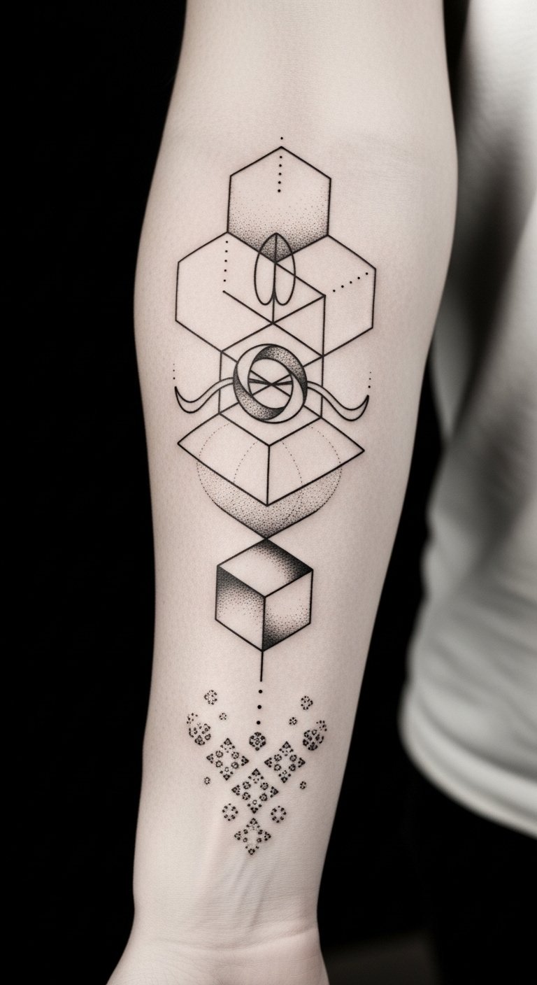 The placement on the forearm allows visibility and personal connection—symbolizing structure (hexagons/triangles), the infinite loop of learning and growth (Möbius strip), and the emergence of complexity from simplicity (fractal fades); emotionally it balances pride and introspection, a tasteful, enduring mark of transition.