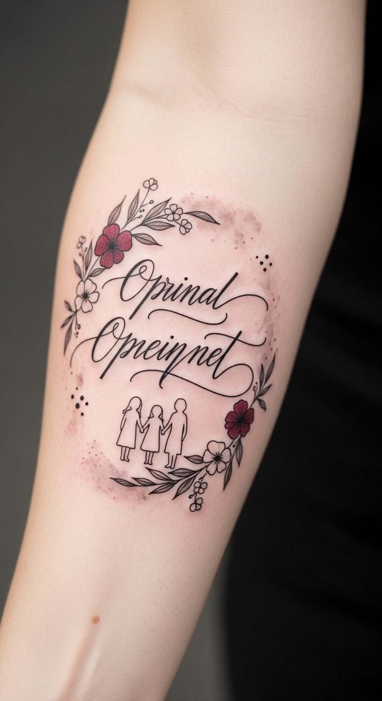 The wreath and silhouettes symbolize unity and generations, the flowing script carries personal voice and memory, and the single burgundy bloom marks a focal loved one; emotionally this design balances reverence and warmth, suited to the inner forearm for regular visibility and intimate remembrance.