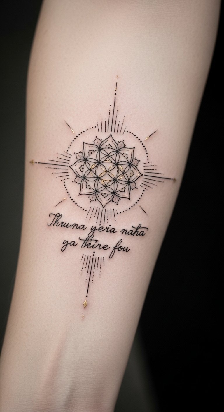 A compact forearm piece balances sacred geometry and text to symbolize inner harmony and guided purpose; the mandala center represents unity and spiritual structure while the mantra grounds daily intention.