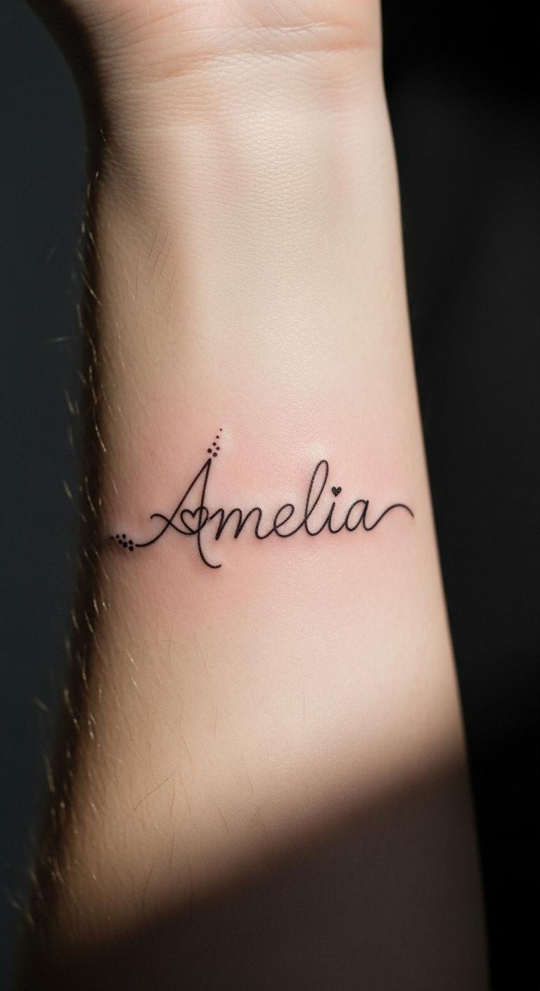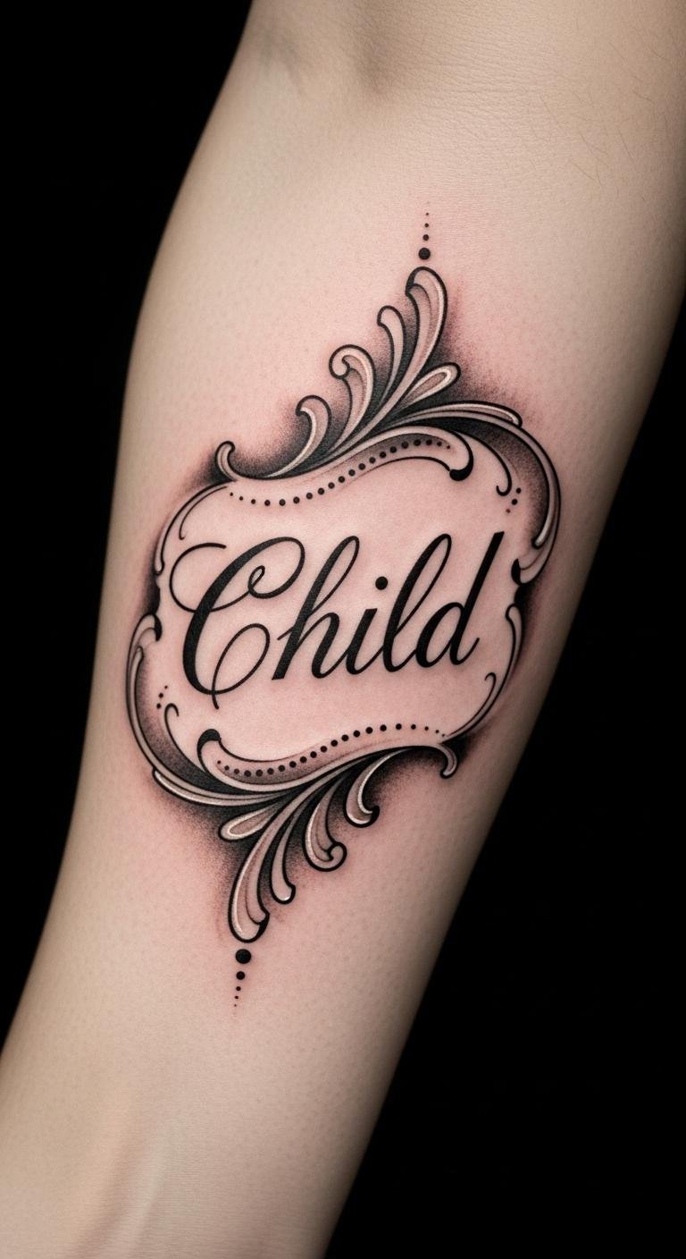 Sometimes, a simple name tattoo speaks volumes about the bond you share with your child. Embracing minimalist elegance, these designs focus solely on the name, allowing it to shine as a powerful focal point. Each stroke reflects your love, celebrating the unique family bond you cherish. In their simplicity, these tattoos capture the profound connection that defines your relationship, beautifully and timelessly. This concept symbolizes intimacy and permanence—the flowing script conveys continuity of care, micro-dot accents mark milestones, and the hidden heart embodies love beneath the surface; placed on the forearm it remains visible for daily reassurance yet discreet enough to feel personal.