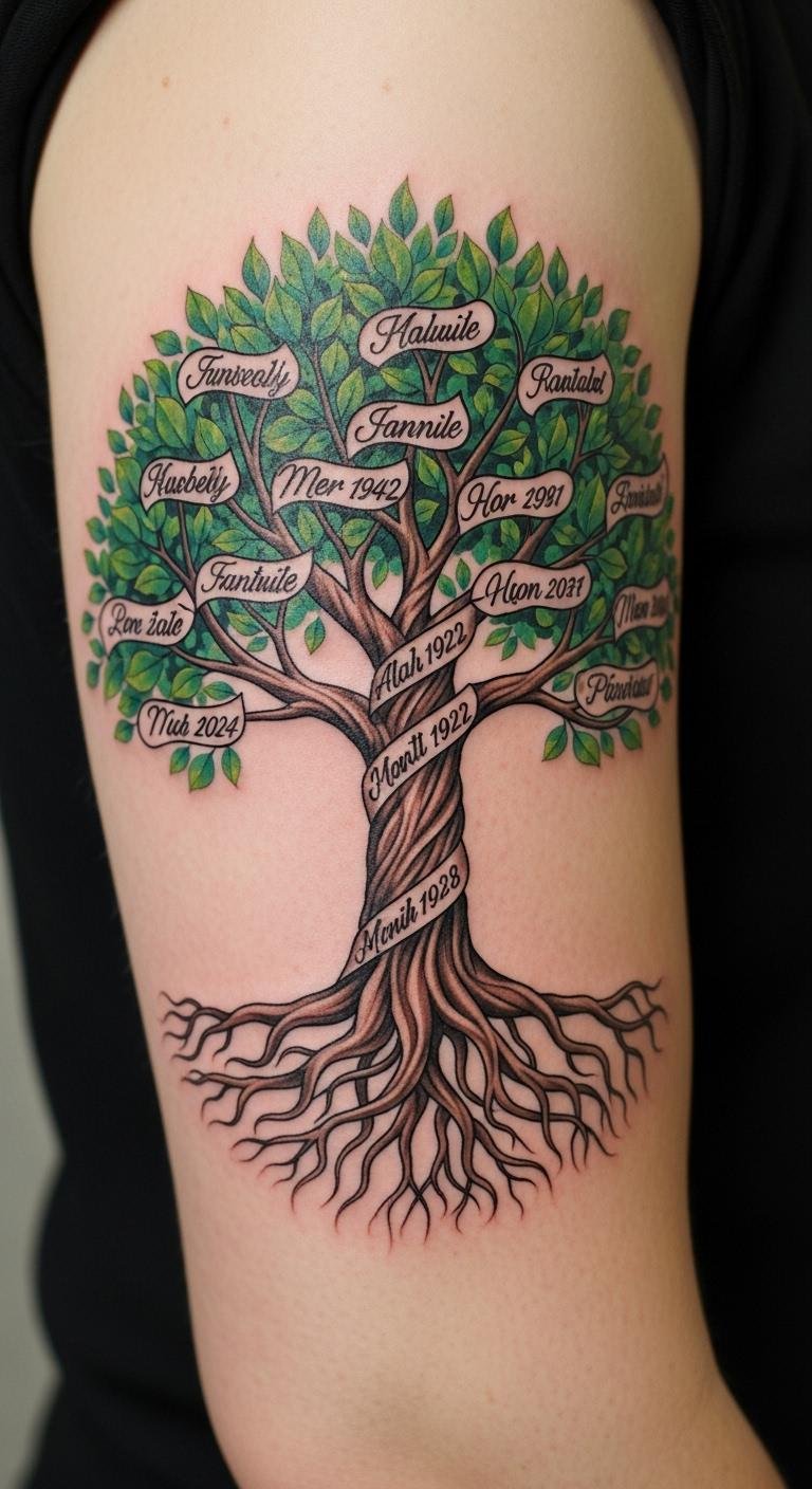 Symbolically it balances growth (leaves, upward-reaching branches) with origin (deep, textured roots), creating an emotional narrative of remembrance, pride, and hope—subtle shading and delicate script amplify tenderness while bolder linework in the trunk conveys resilience.