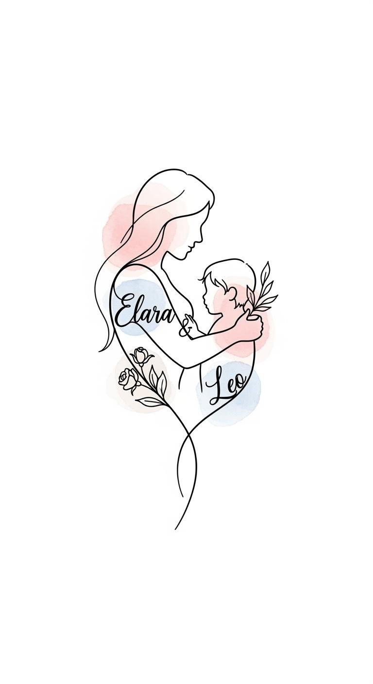 This design symbolizes the seamless, enduring connection between parent and child, combining the intimacy of the child’s own handwriting with the universal symbol of love; the soft watercolor background evokes tenderness and warmth while the continuous line suggests unbroken devotion and life’s flowing journey. Emotionally, it reads as both personal and timeless—perfect for a spot like the inner forearm where you can easily glance at it during quiet moments or when you want to feel close to your child; the scale and delicate linework keep it subtle yet deeply meaningful.