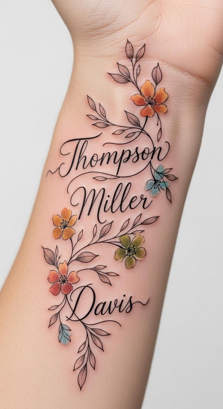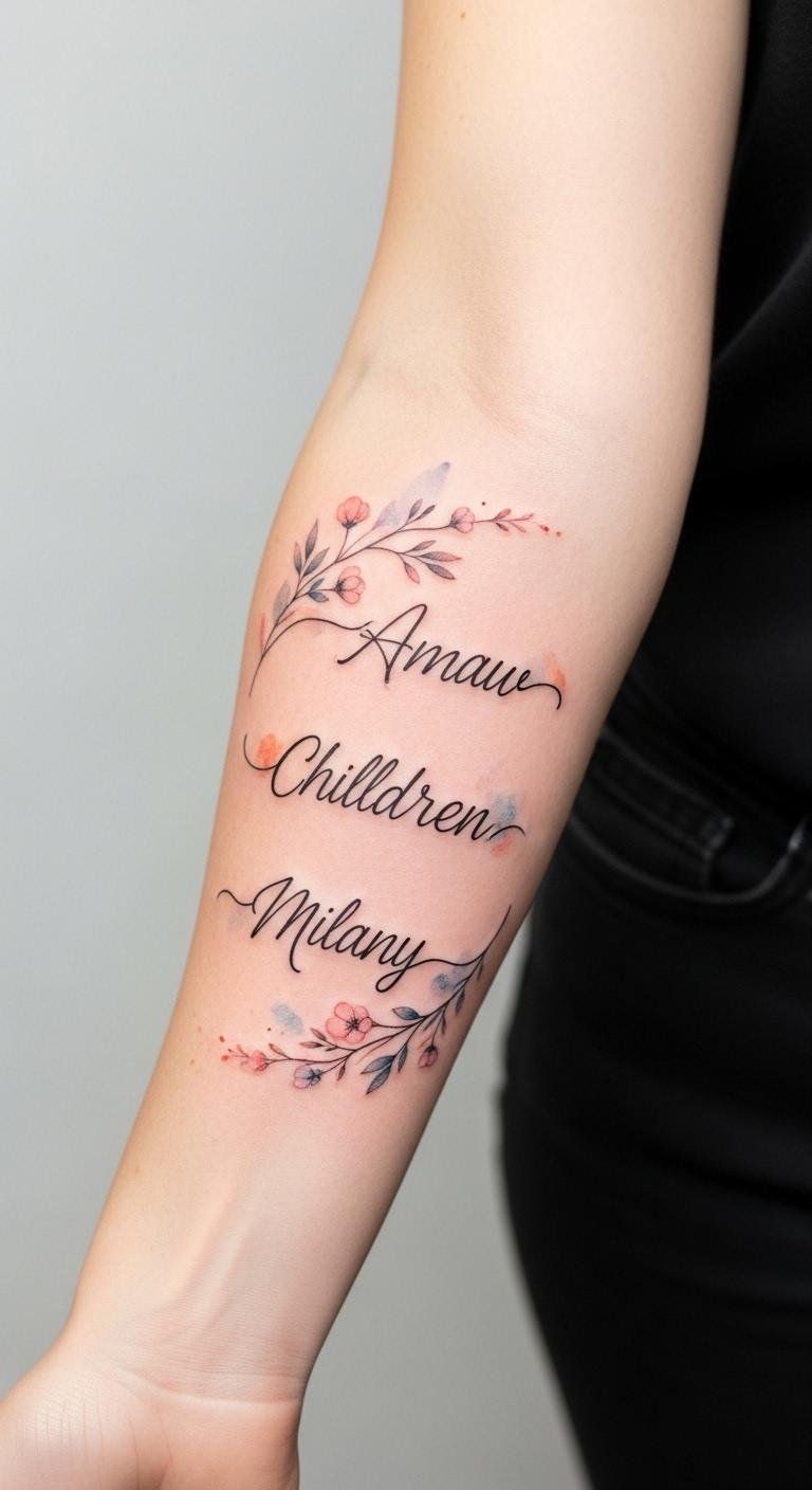 The names in flowing script represent individuality and personal identity, while the winding branch and blossoms symbolize growth, connection, and the ongoing life shared between parent and children; soft pastel watercolor accents evoke tenderness and memory, and placing the design on the inner forearm makes it a private yet visible daily emblem of affection that can be easily shown or covered, with attention to aftercare ensuring the colors and fine line details remain vivid over time.