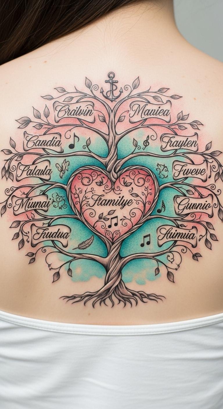When placed along the upper back, forearm, or ribcage, this family tree design becomes a personal emblem of continuity and belonging; the branches can gently curve to follow body contours, names and dates woven into fine-line branches evoke intimacy, and the roots can taper toward the spine or hip to suggest grounding.