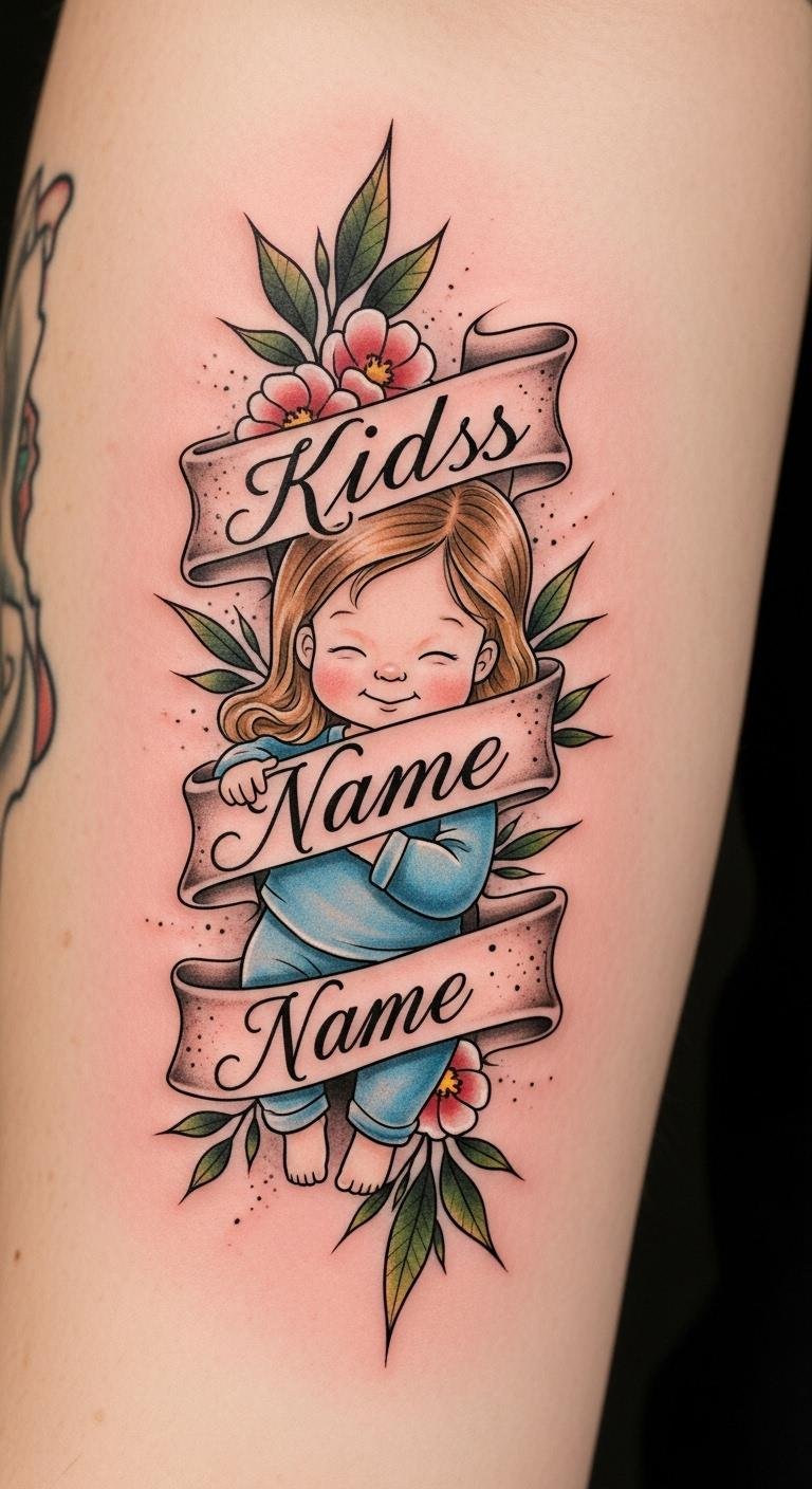 This design places the child’s name woven into a flowing ribbon of natural elements—small leaves, stars, and subtle animal motifs—curving along the forearm or collarbone. Symbolically, the ribbon represents continuity and protection, leaves for growth, stars for guidance, and the animal motif for the child’s personality or spirit. Emotionally it reads as a quiet, intimate tribute that can be shown or kept private depending on placement; the forearm offers visibility and daily comfort, while the collarbone or ribcage provides a more private, close-to-heart expression of the parent-child bond.