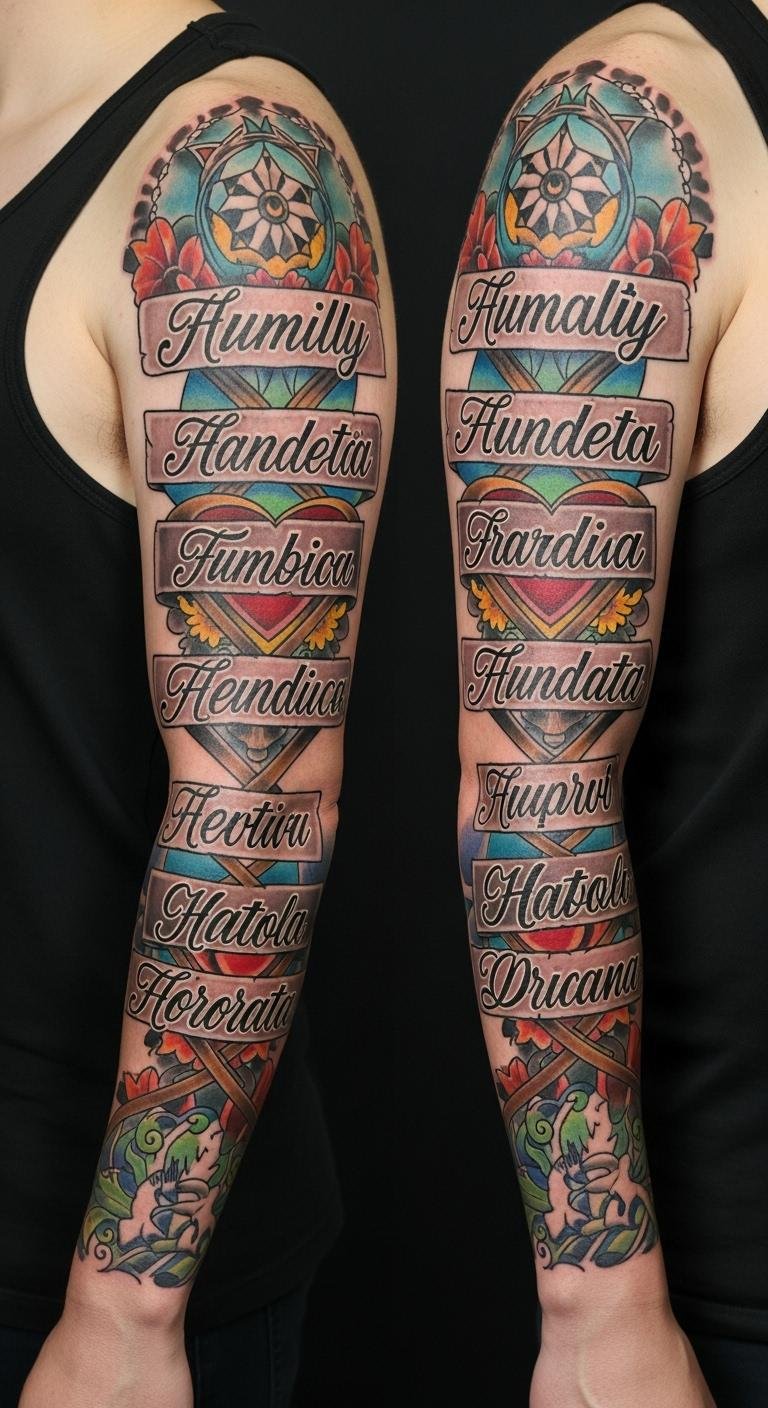This full-sleeve concept translates the original text into a cohesive visual: flowing bands connect portraits, names, and heirloom motifs like lockets, trees, and guardian animals, rendered in a mix of realistic and illustrative styles with selective vibrant color accents against muted shading. Symbolically, intertwining names and protective icons convey unity, legacy, and devotion; the mix of textures reflects individual personalities within the family, and bold color highlights mark pivotal memories. Emotionally, the piece celebrates love, resilience, and belonging; place it wrapping the arm from shoulder to wrist so each segment reads as a chapter when viewed up close or as a continuous tapestry from afar.