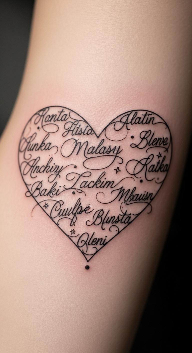 These designs embrace heart symbolism, visually representing the depth of family connections. Each name intertwines within the shape, creating a striking reminder of your unwavering love, forever etched on your skin.