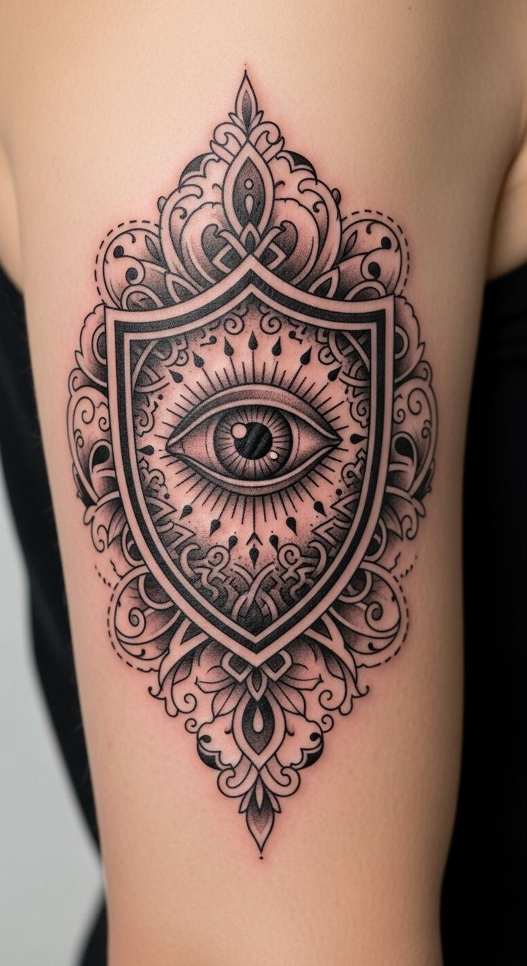 A compact forearm or chest piece centered on a stylized shield cradling a single protective eye, flanked by subtle vines that form abstract parent-and-child figures; fine-line dotwork for texture, gentle stippling for depth, and soft muted inks (deep indigo, charcoal, and warm sepia) to convey warmth and permanence. Symbolically the eye represents vigilance and the shield denotes safeguarding; the entwined vines signify the nurturing bond and growth shared with your children. Emotionally the design communicates unwavering devotion and quiet strength—ideal over the heart, along the inner forearm, or on the shoulder blade where it reads both as a private talisman and a visible pledge of protection.