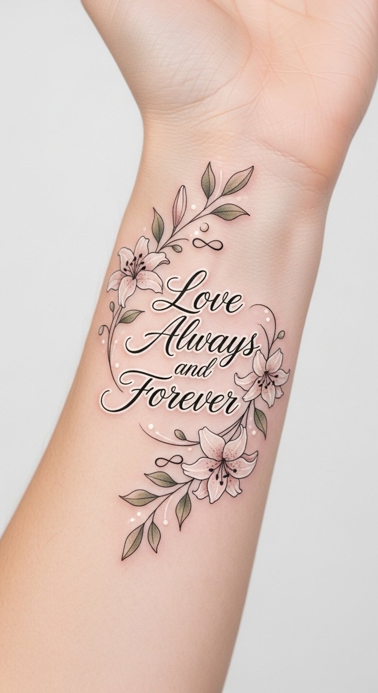It invites you to reflect on your own connections, urging you to celebrate the relationships that shape your life and define your freedom. The entwined lilies and hidden infinity loops reinforce themes of purity, continuity, and enduring commitment; the soft watercolor tones add vulnerability and warmth, while the fine-line script and curved placement along the inner wrist or outer forearm make it intimate yet visible—ideal for someone who wants a constant, gentle reminder of lasting love and personal liberation.