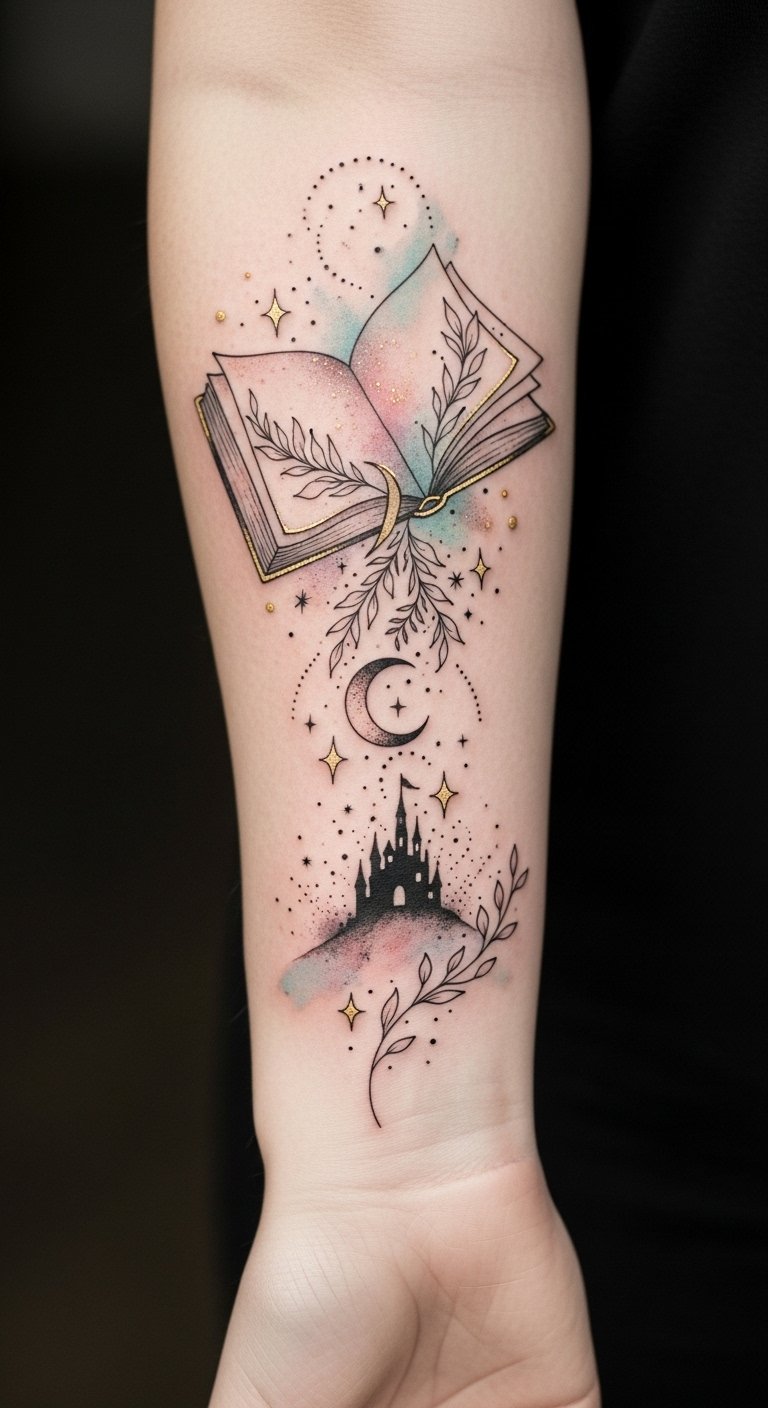Emotionally it aims to evoke nostalgia, hope, and quiet resilience, blending whimsy with introspective calm. Ideal placement is the inner forearm for visibility and intimacy, with the book near the wrist so pages “flow” toward the elbow, or scaled for the ribcage to keep the piece private and personal.