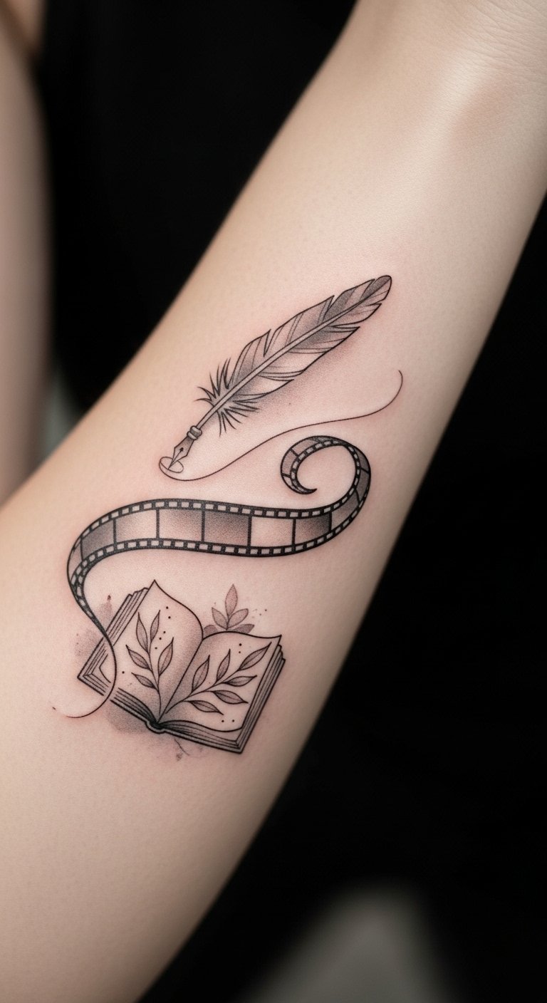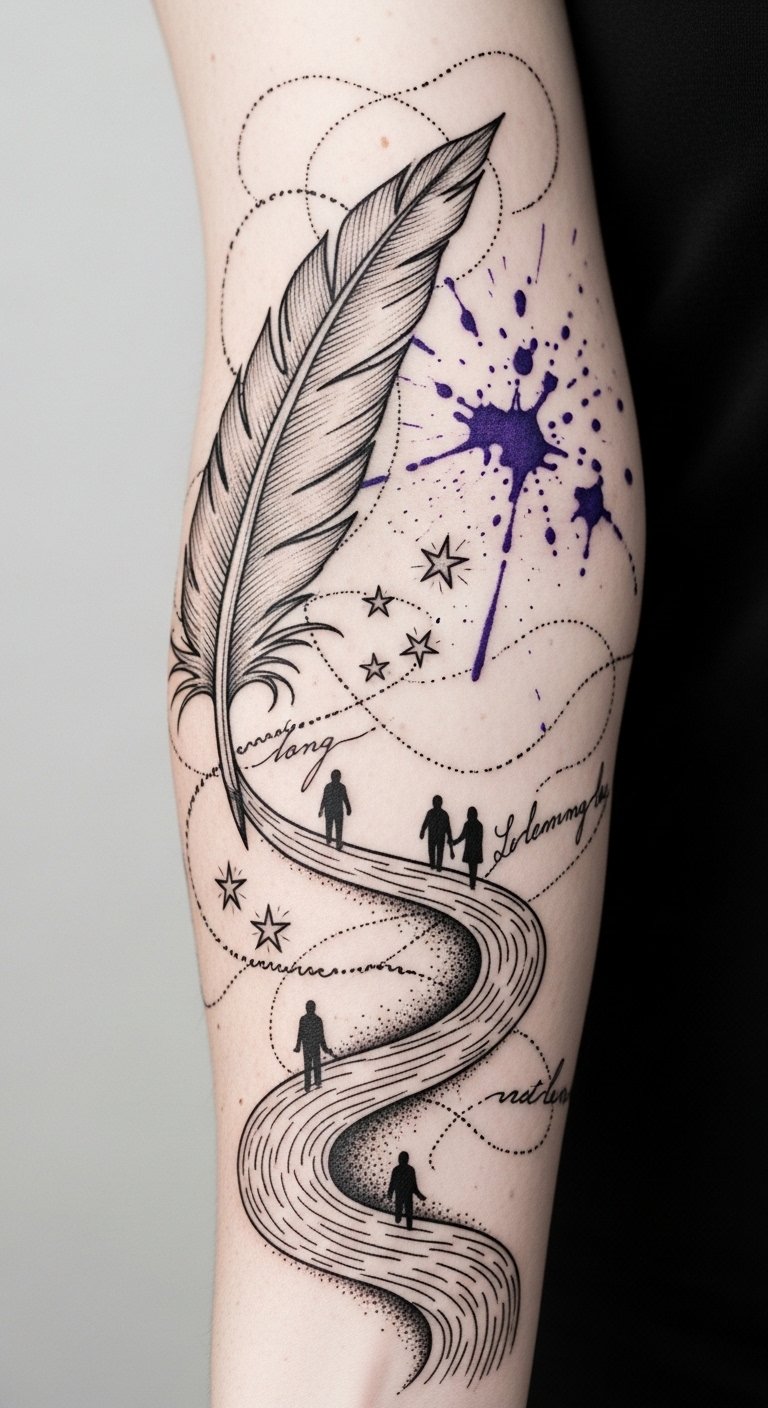 Embracing creative freedom, you can transform your skin into a canvas, celebrating who you’re and what you stand for, making every tattoo a bold declaration of self. This design uses the quill and river as symbols of voice and life’s path, the silhouettes as personal milestones, and stars/ink splatters to represent inspiration and risk; the fine-line style evokes intimacy and introspection, suited to a forearm or ribcage placement where it can be both revealed and kept private, carrying emotional weight as a wearable narrative.