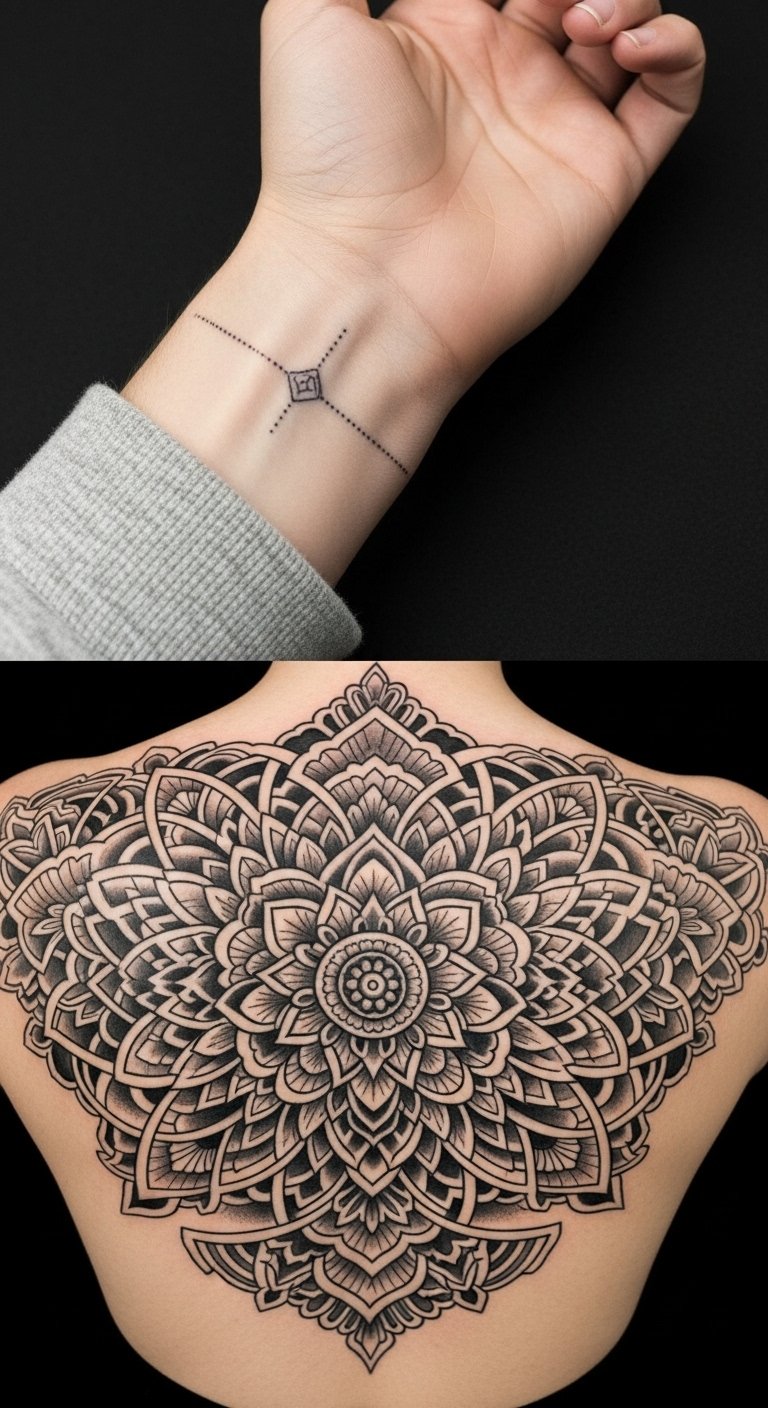 Choosing the right placement for your tattoo can elevate its meaning and enhance its visual impact. Consider how tattoo size and symmetry play into this decision. A small design on your wrist might exude subtlety, while a larger piece on your back can make a bold statement. Embrace the freedom to express yourself, finding harmony between placement and personal significance. This design pairs a delicate, symmetrical wrist emblem—fine-line crescent and single star—with a sweeping, bold back composition of interlacing mandala petals; the wrist piece symbolizes private strength and daily reminder, the back piece represents expansive identity and courage, and together they balance intimacy and proclamation, inviting placement where visibility and personal resonance align.