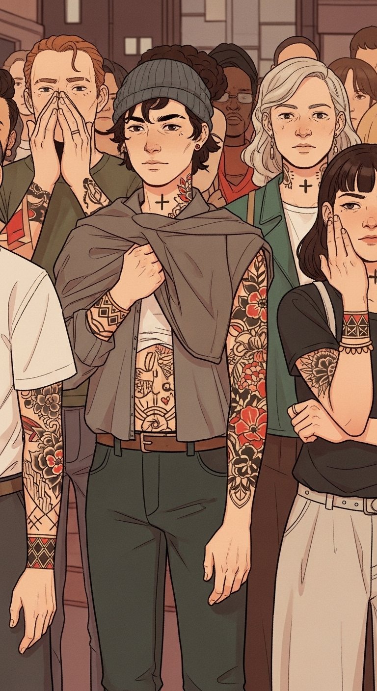 Ideal placement for a tattoo adaptation of this concept would be a back or chest mural to allow space for multiple figures and scenes, or a sleeve where successive panels can portray the changing reactions and evolving public perception.