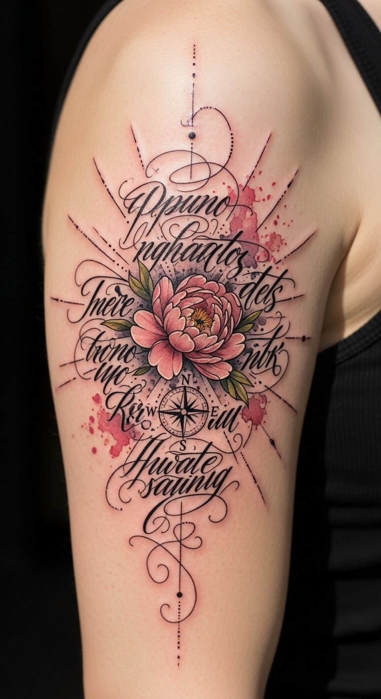 Each word intertwines with vivid imagery, sparking conversations and evoking emotions, allowing you to express your identity and beliefs in an alluring, artistic way. The peony symbolizes resilience and beauty, the compass signifies guidance and personal direction, and the flowing script unites them to suggest that words guide growth.