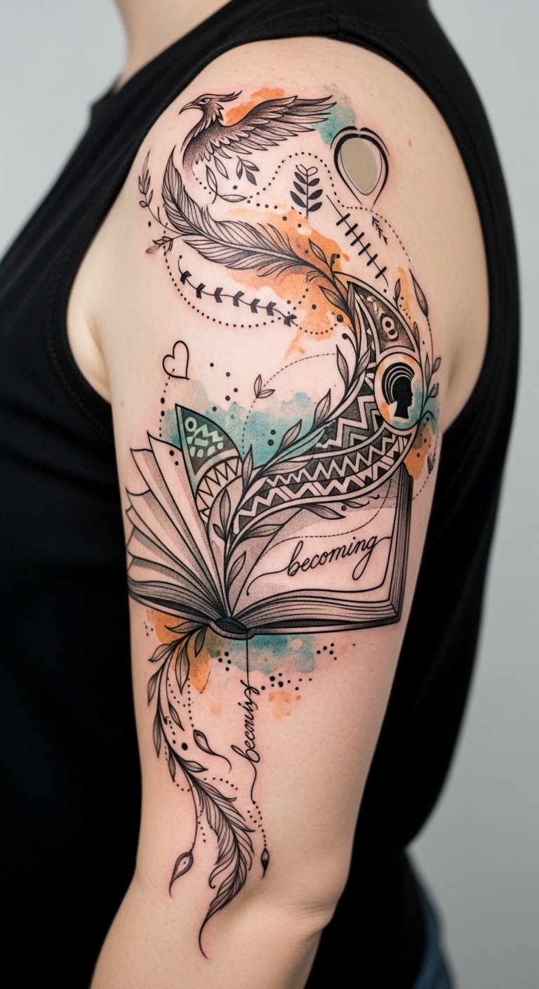 This design uses the book as personal narrative, birds and vines as growth and liberation, and scattered symbols as facets of identity; placed on the inner forearm it invites intimate viewing and conversation, evoking introspection, resilience, and openness while remaining adaptable to broader placements.