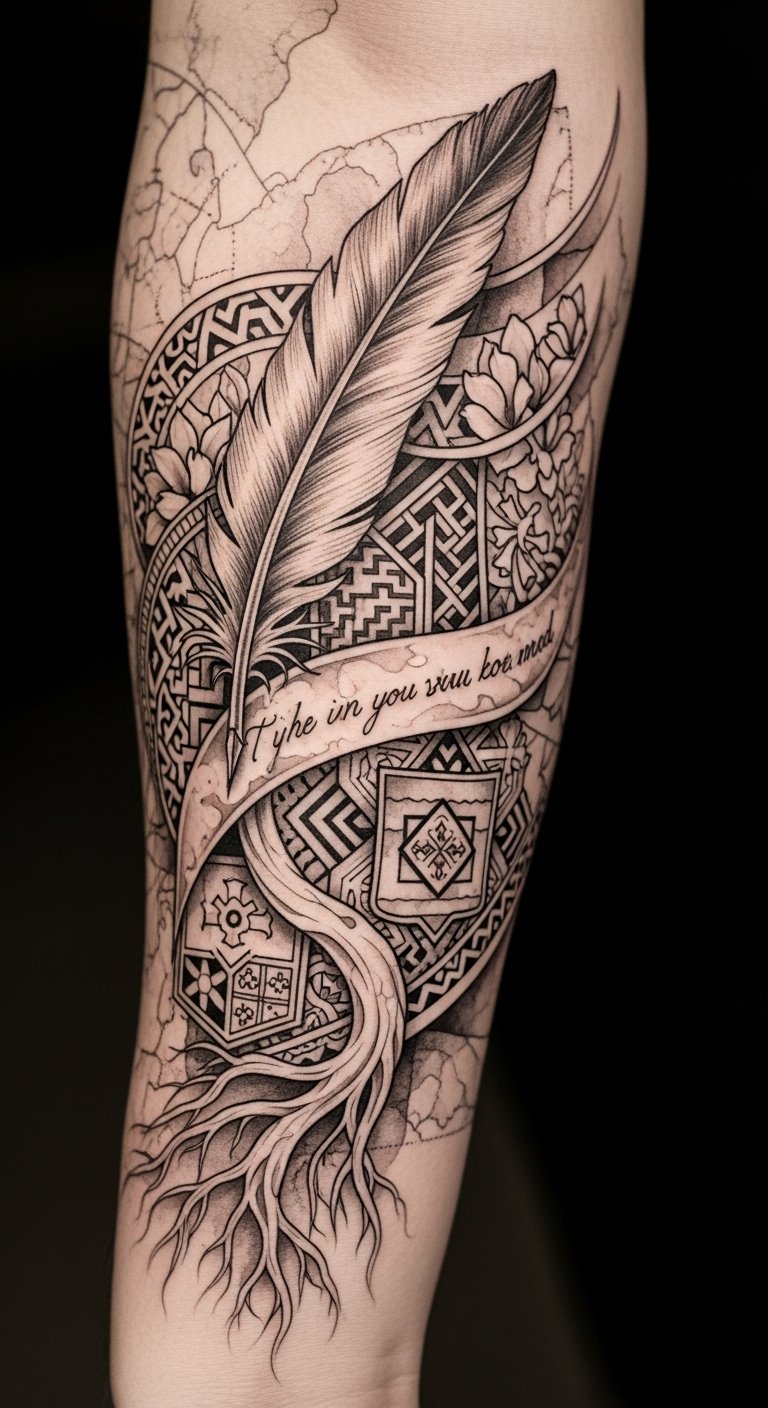The quill-to-root motif symbolizes the continuity between written memory and ancestral grounding; cultural motifs and crests signify heritage and community ties, while floral emblems convey growth and resilience.